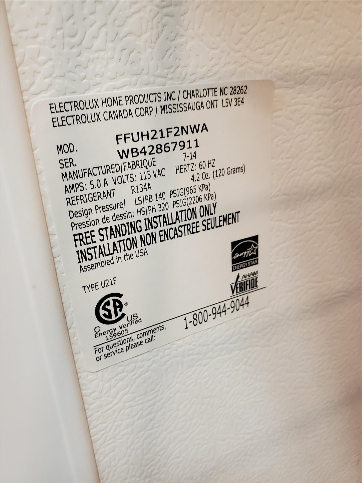 Electrolux 20.5 cu ft upright freezer, model FFUH21F2NWA