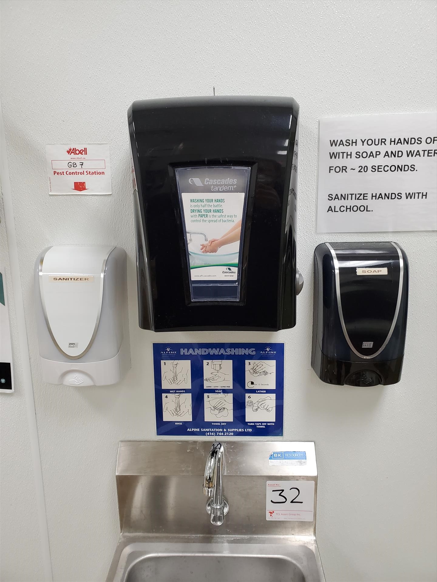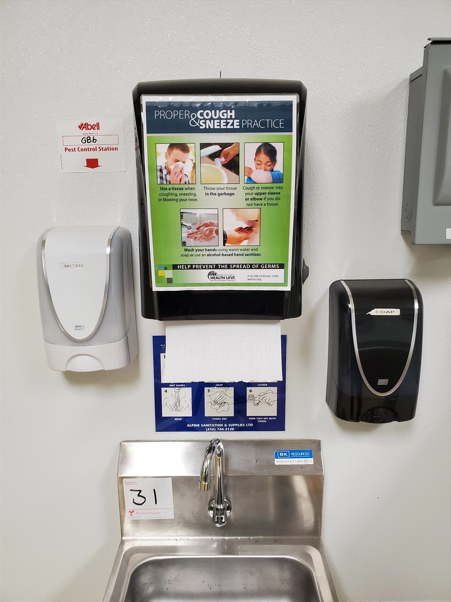 (6) wall-mounted sanitizer/soap dispensers and (3) paper towel dispensers