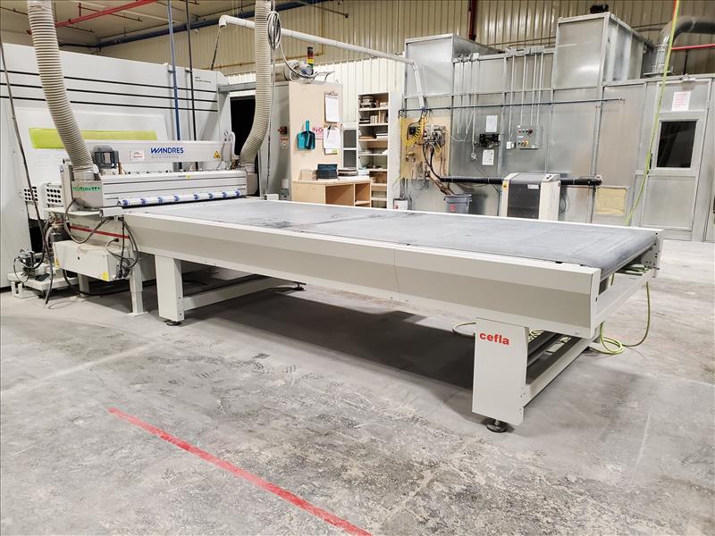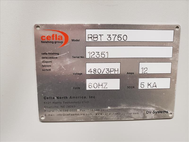 Cefla infeed power VSD belt conveyor, mod. RBT3750, ser. no. 12351, approx. 54.25 in. W x 143 in. L, abrasion/solvent resistant antistatic belt