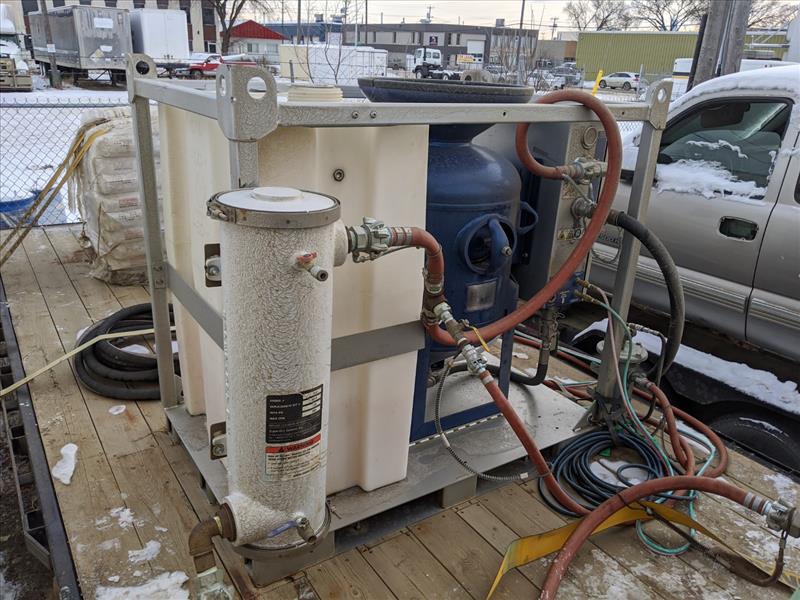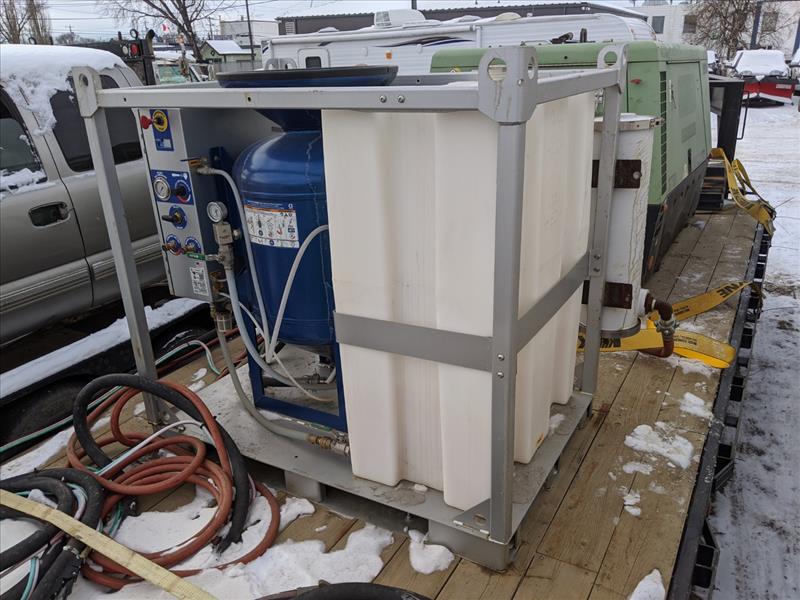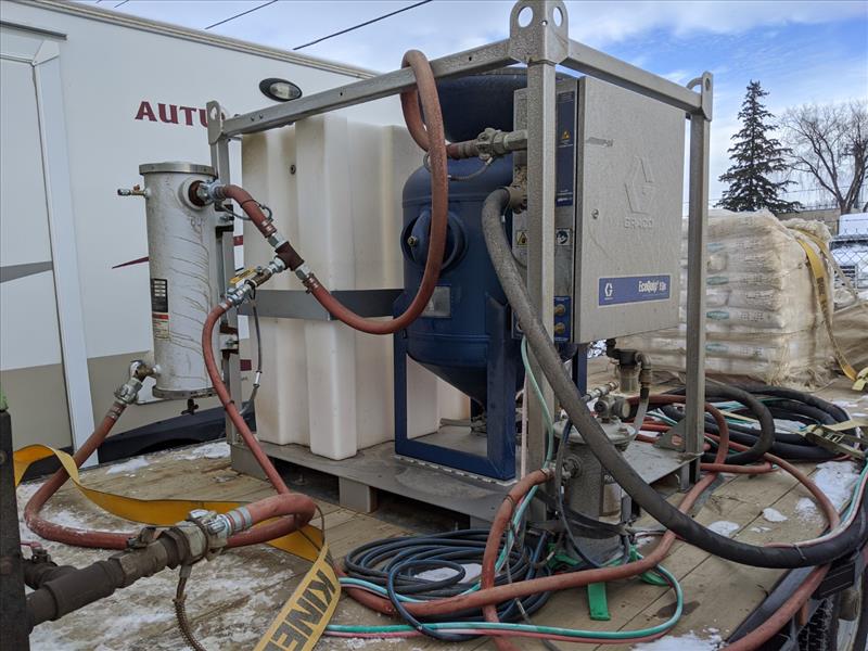 SOLD-2018 Graco EcoQuip 2 EQs Wet Abrasive System featuring: control box, water tank and abrasive pot attached, a D-4 Air Dryer, automatic timer, 110v, CSA blast pot, 6.5 cubic ft, portable, electric, auto valve lid, twenty-four inch vessels, and two wet abrasive hoses.