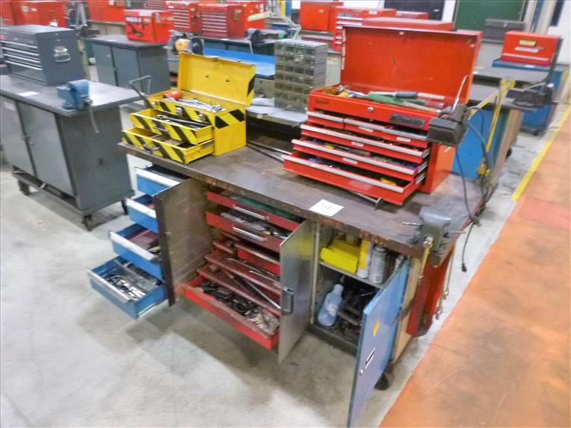 Rolling Work Bench, approx. 30 in. x 72 in. c/w 4 in. Bench Vice & Contents (Hand Tools, Spare Parts, Consumables, Etc.)