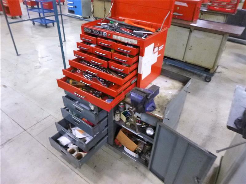 Rolling Work Bench, approx. 24 in. x 42 in. c/w 4.5 in. Bench Vice & Contents (Hand Tools, Spare Parts, Consumables, Etc.)