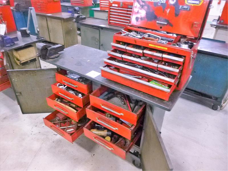 Rolling Work Bench, approx. 24 in. x 60 in. c/w 4 in. Bench Vice & Contents (Hand Tools, Spare Parts, Consumables, Etc.)