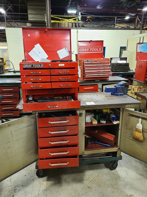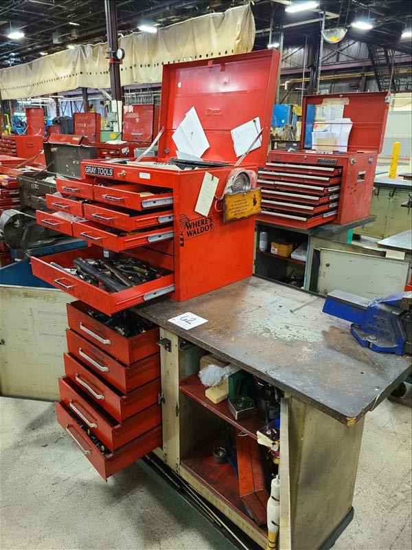 Rolling Work Bench, approx. 24 in. x 60 in. c/w 4.5 in. Bench Vice & Contents (Hand Tools, Spare Parts, Consumables, Etc.)