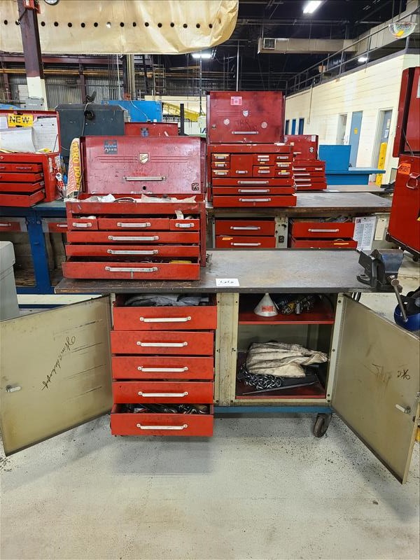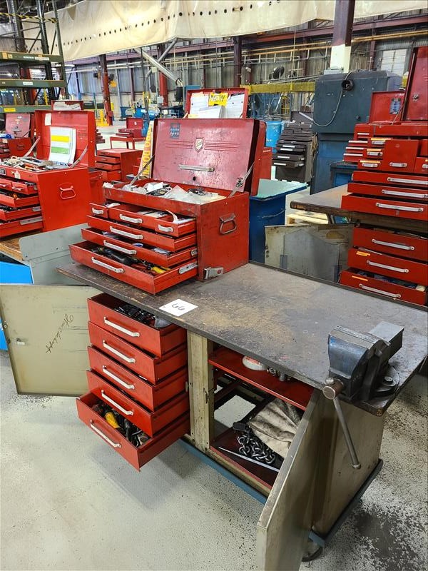 Rolling Work Bench, approx. 24 in. x 60 in. c/w 4 in. Bench Vice & Contents (Hand Tools, Spare Parts, Consumables, Etc.)