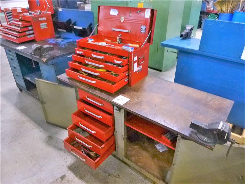 Rolling Work Bench, approx. 24 in. x 60 in. c/w 6 in. Bench Vice & Contents (Hand Tools, Spare Parts, Consumables, Etc.)