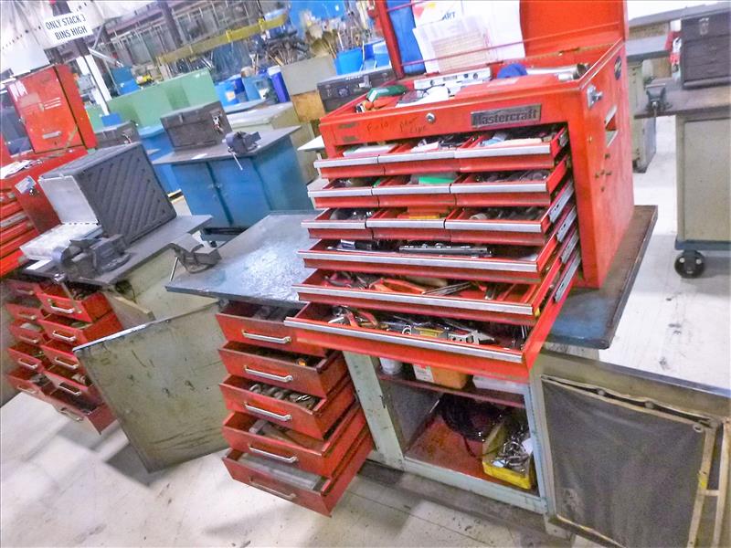 Rolling Work Bench, approx. 24 in. x 60 in. c/w 3 in. Bench Vice & Contents (Hand Tools, Spare Parts, Consumables, Etc.)