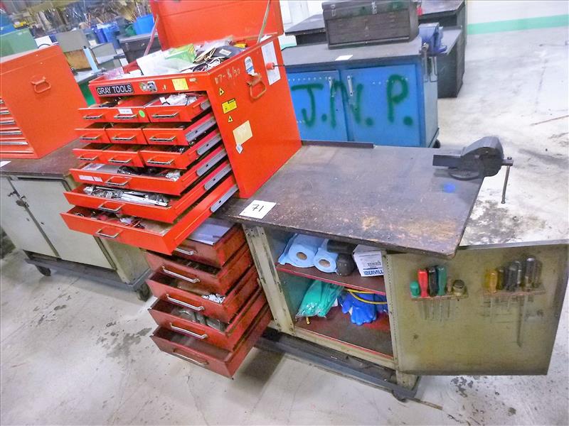 Rolling Work Bench, approx. 24 in. x 60 in. c/w 3 in. Bench Vice & Contents (Hand Tools, Spare Parts, Consumables, Etc.)