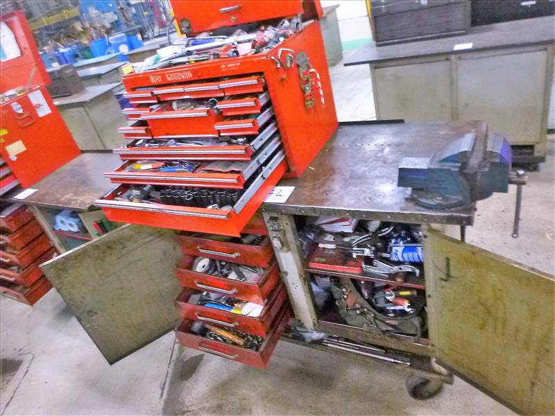 Rolling Work Bench, approx. 24 in. x 60 in. c/w 4 in. Bench Vice & Contents (Hand Tools, Spare Parts, Consumables, Etc.)