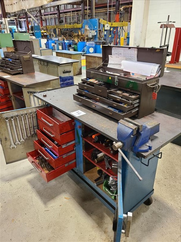 Rolling Work Bench, approx. 24 in. x 60 in. c/w 4.5 in. Bench Vice & Contents (Hand Tools, Spare Parts, Consumables, Etc.)