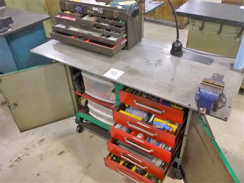Rolling Work Bench, approx. 24 in. x 60 in. c/w 4 in. Bench Vice & Contents (Hand Tools, Spare Parts, Consumables, Etc.)
