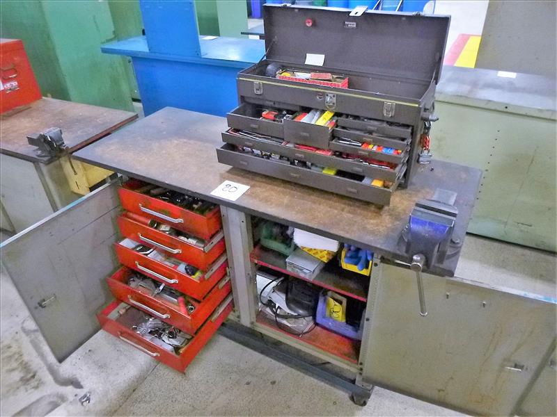 Rolling Work Bench, approx. 24 in. x 60 in. c/w 4 in. Bench Vice & Contents (Hand Tools, Spare Parts, Consumables, Etc.)