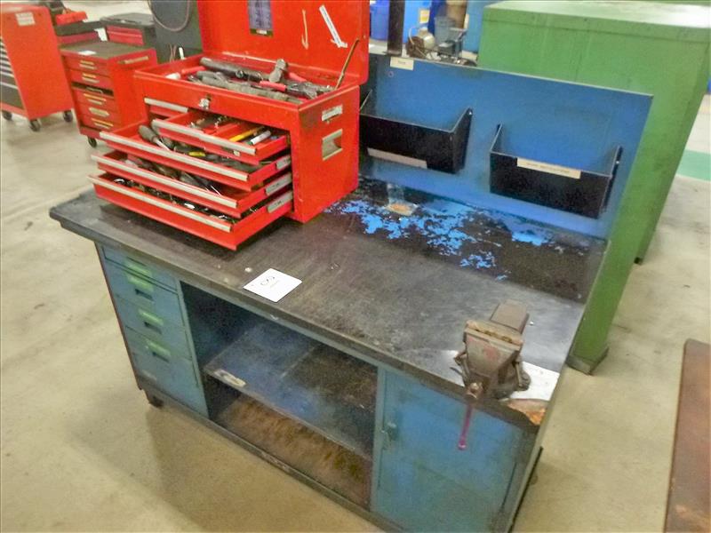 Rolling Work Bench, approx. 30 in. x 60 in. c/w 4 in. Bench Vice & Contents (Hand Tools, Spare Parts, Consumables, Etc.)