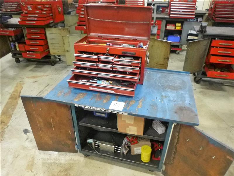 Rolling Work Bench, approx. 30 in. x 48 in. c/w Contents (Hand Tools, Spare Parts, Consumables, Etc.)