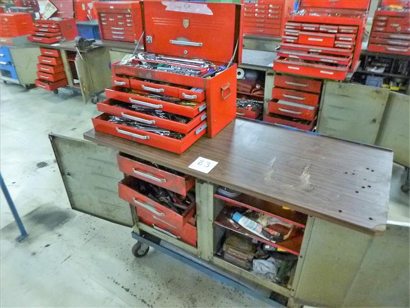 Rolling Work Bench, approx. 24 in. x 60 in. c/w Contents (Hand Tools, Spare Parts, Consumables, Etc.)