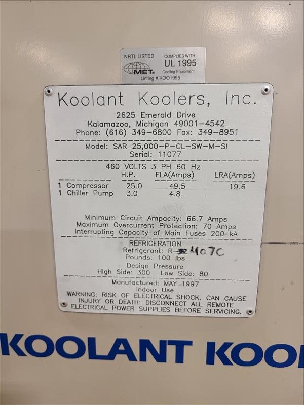 KOOLANT KOOLERS SAR-25,000-P-CL-SW-M-SI Chiller, s/n 11077