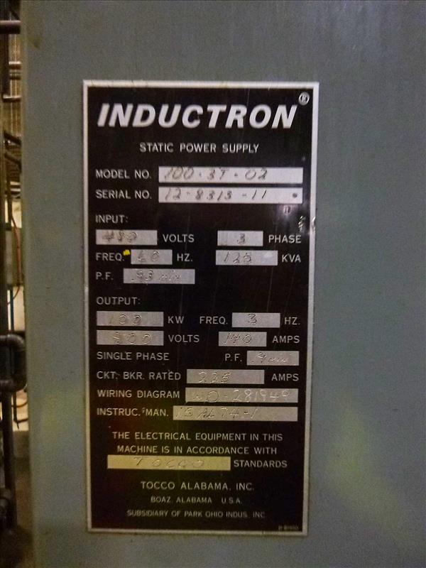 TOCCO Tempering Unit w/ INDUCTRON 100-3T-02 100 kw, s/n 12-8313-11 c/w Distilled Water Cooling/Quenching Skids & Temper T/B Control Panel, s/n 12-8313-81