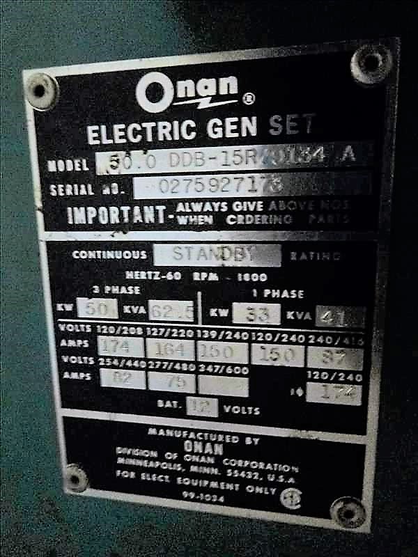 ONAN 50.0 DDB-15R/9134 A 50 kw Generator, s/n 0275927173, w/ John Deere 6 cyl Diesel
