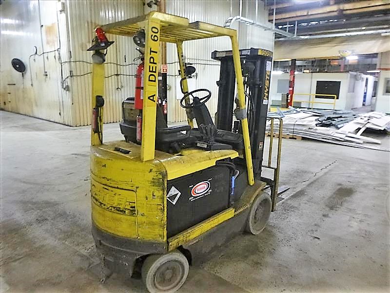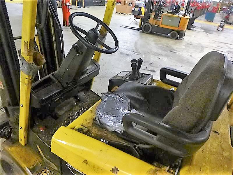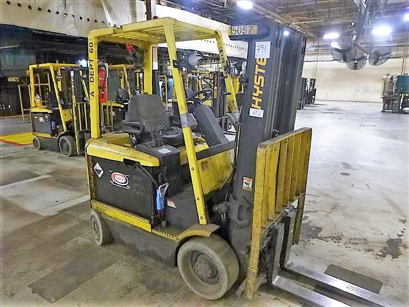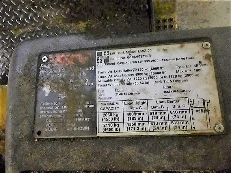 HYSTER E50Z-33 Fork Lift Truck, s/n G108V01720B, 5000 lbs. cap., 3-Stage Mast, 189 in. Lift Height, Side-Shift, Cushion Tires, 48V Electric (Charger Sold Separately)