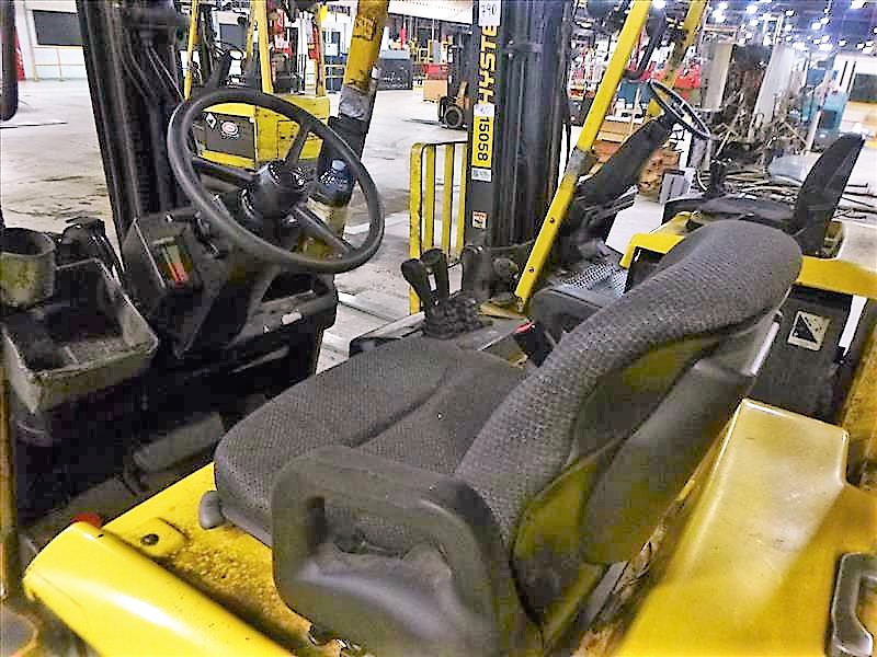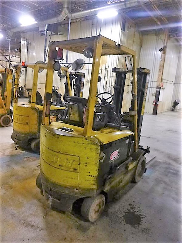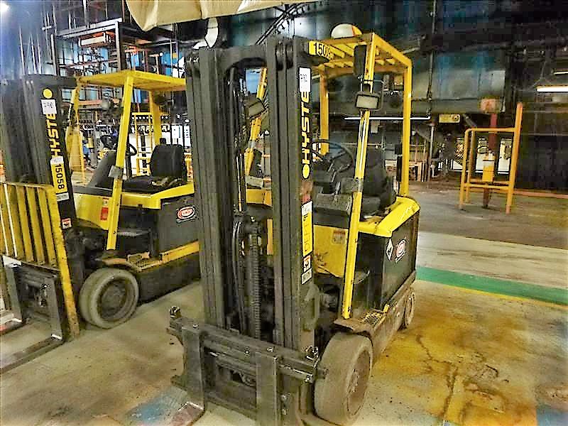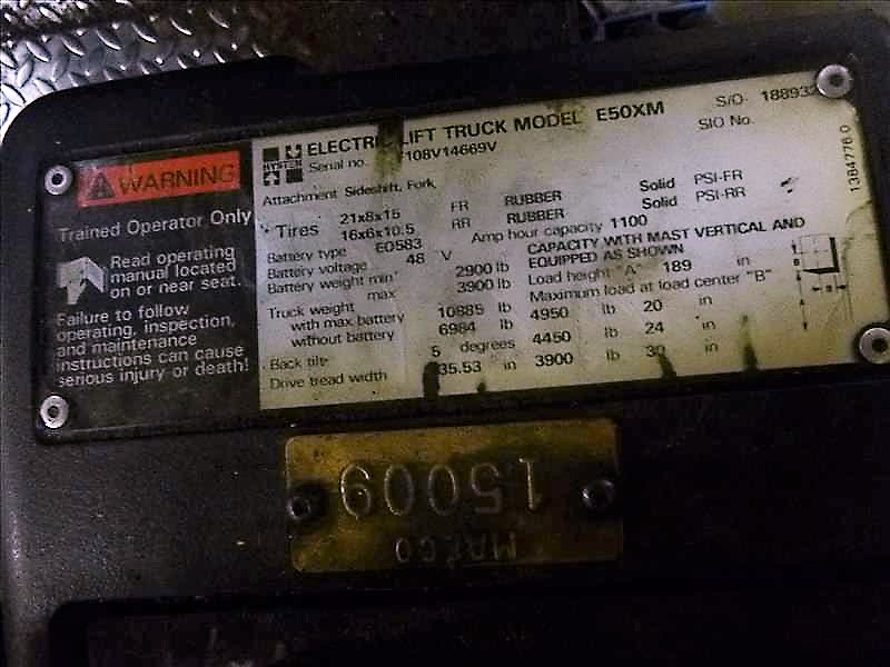HYSTER E50XM Fork Lift Truck, s/n F108V14669V, 5000 lbs. cap., 3-Stage Mast, 189 in. Lift Height, Side-Shift, Cushion Tires, Meter Reads 8956 hrs., 48V Electric (Charger Sold Separately)