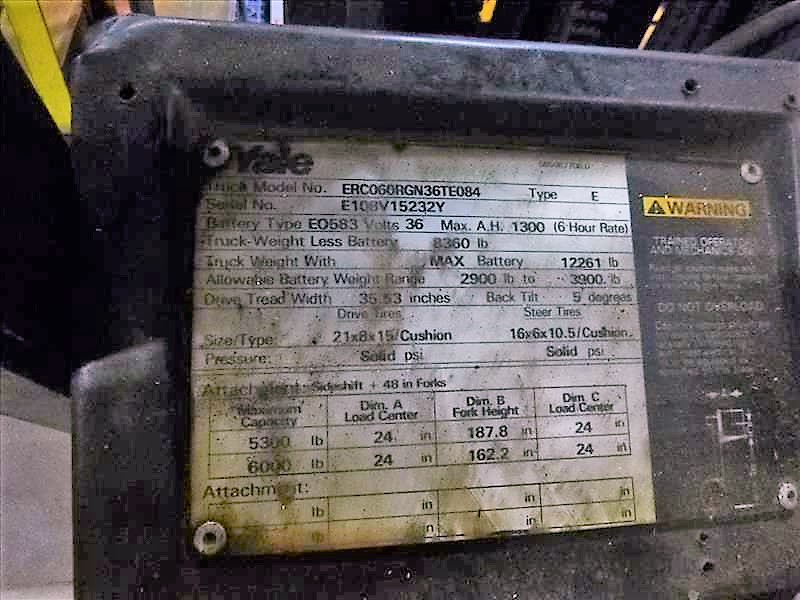 YALE ERC060RGN36TE084 Fork Lift Truck, s/n E108V15232Y, 6000 lbs. cap., 3-Stage Mast, 187 in. Lift Height, Side-Shift, Cushion Tires, Meter Reads 0259 hrs., 36V Electric (Charger Sold Separately)
