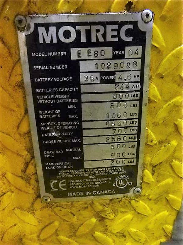 MOTREC E280 Tugger, s/n 1029089, 700 lbs. cap. c/w charger & trailer