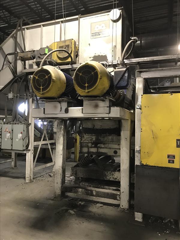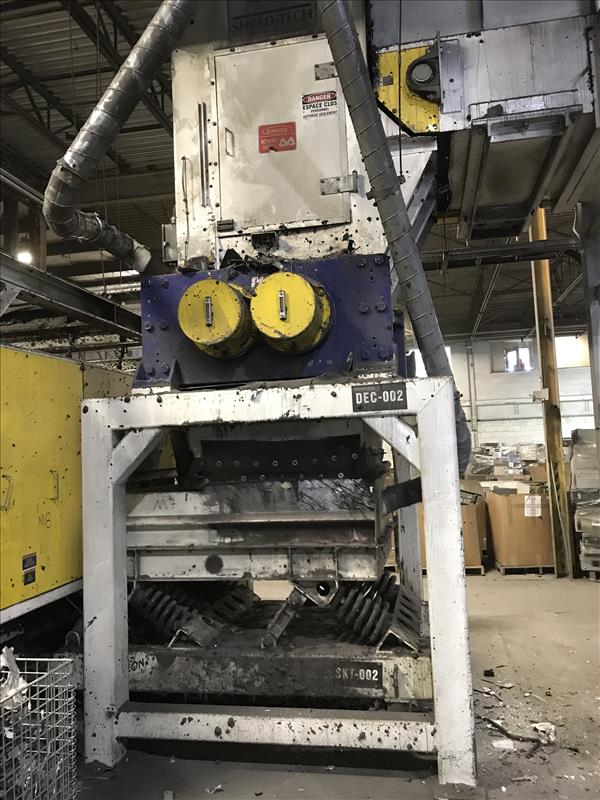 Shred-Tech Shredder, model ST400 w/ Infeed and Outfeed Conveyors with 46 in x 53 in Cutting Chamber, infeed and outfeed conveyor, RSN: 35447, with (2) 150 hp Motors (Totaling 300hp), 4 ft x 12 ft Vibrating Conveyor, Shred-Tech 4 ft x 48 ft Power Steel Belt In Feed Conveyor, and Shred-Tech 4 ft x 40 ft Power Steel Belt Outfeed Conveyor (Quebec Location) [Lots have been disassembled for ease of removal and may not be exactly as pictured]