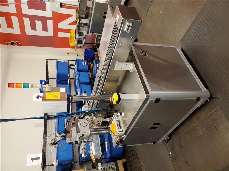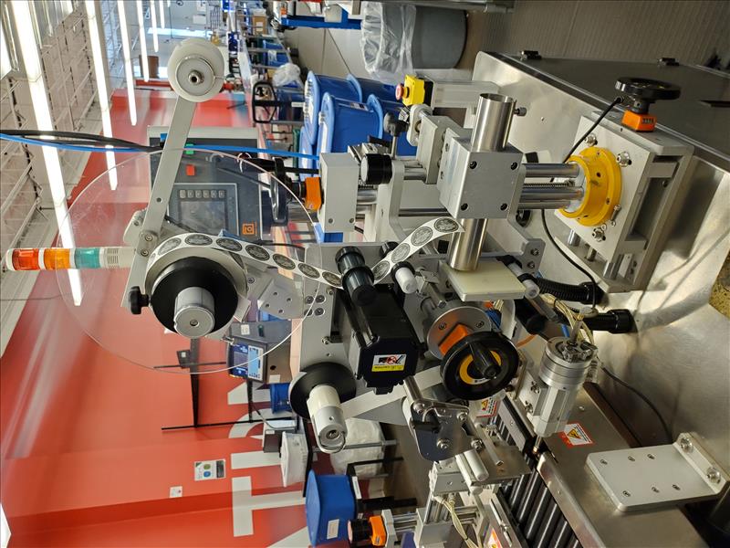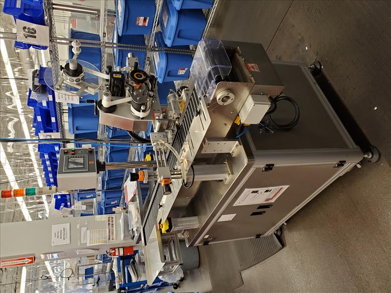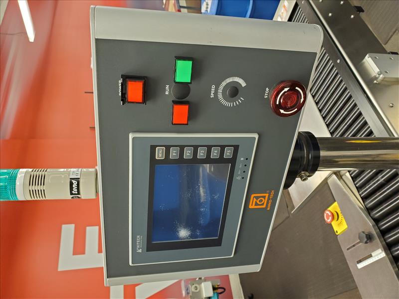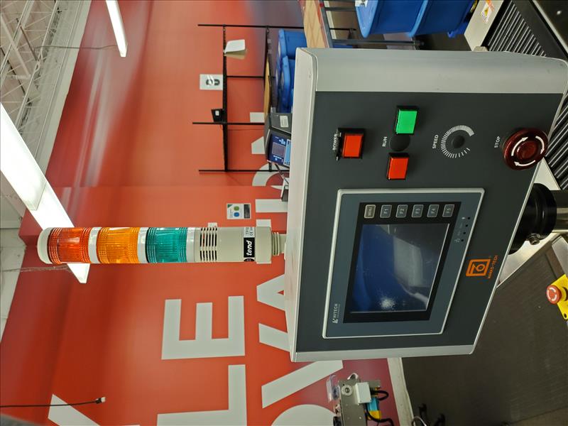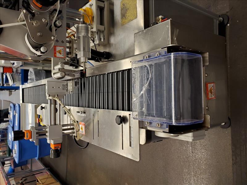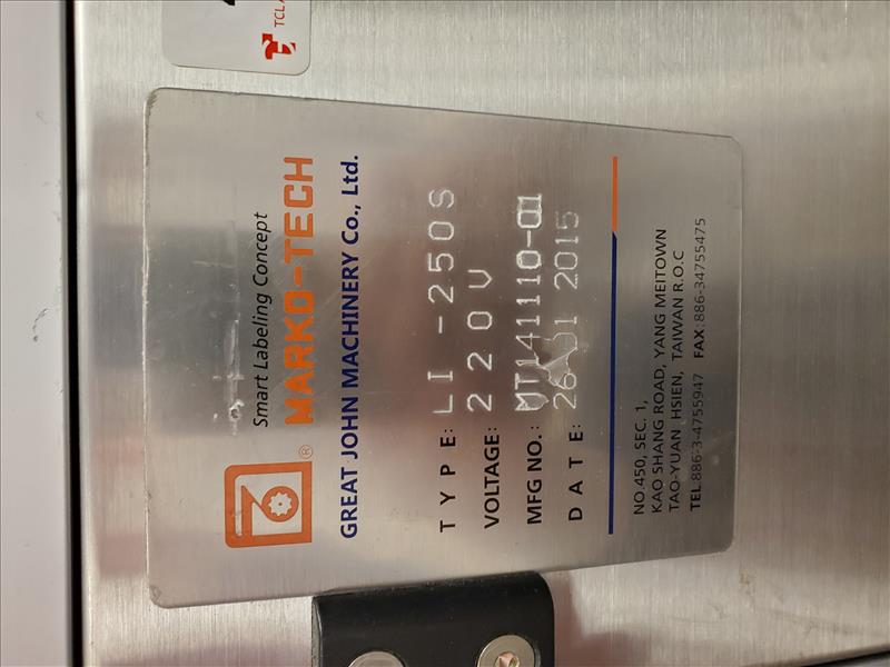 Marko-Tech Automatic Labelling Machine, Model LI-250 S, 50 pc.min, Label: square/ round label, Round label size: A:15mm, B: 13mm, C:9mm, F:11.5mm(suggested); Square label size: G 13mm x 13mm, Label width: 50mm (Max); w/ LI-250S applicator; HI-TECH touch panel and Mitsubishi PLC control; tamp-on labeling head S/N MT141110-01(2015)
