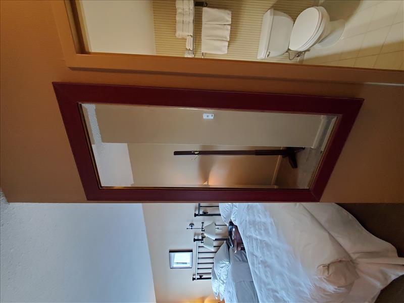 Double Bedroom featuring: two beds and frames, metal headboards, night stand, desk, desk chair, side chair, lamps, mirror, pictures, and window coverings (NOT INCLUDED: ALL BEDSHEETS, PILLOWS, LINENS, TOWELS, TELEVISION, PHONE SYSTEMS, COFFEE MAKERS, ALARM CLOCKS, GARBAGE BINS, & HEALTH & BEAUTY PRODUCTS ).