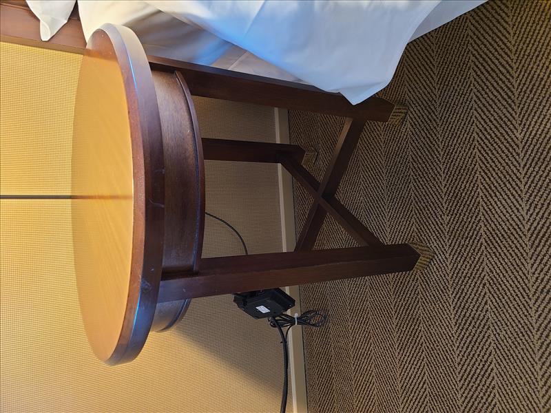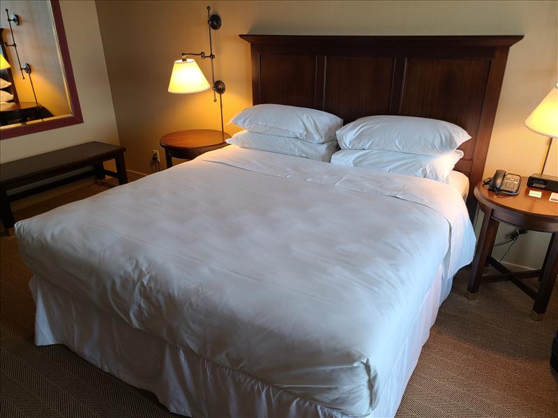 King Bedroom featuring: king size bed and frame, wood headboard, night stand, desk, desk chair, side chair, dresser, lamps, mirror, pictures, and window coverings (NOT INCLUDED: ALL BEDSHEETS, PILLOWS, LINENS, TOWELS, TELEVISION, PHONE SYSTEMS, COFFEE MAKERS, ALARM CLOCKS, GARBAGE BINS, & HEALTH & BEAUTY PRODUCTS).