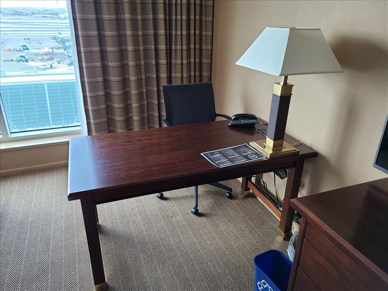 King Bedroom featuring: king size bed and frame, wood headboard, night stand, desk, desk chair, side chair, dresser, lamps, mirror, pictures, and window coverings (NOT INCLUDED: ALL BEDSHEETS, PILLOWS, LINENS, TOWELS, TELEVISION, PHONE SYSTEMS, COFFEE MAKERS, ALARM CLOCKS, GARBAGE BINS, & HEALTH & BEAUTY PRODUCTS).