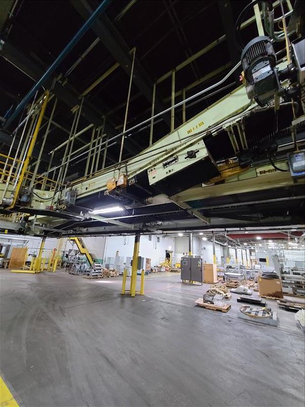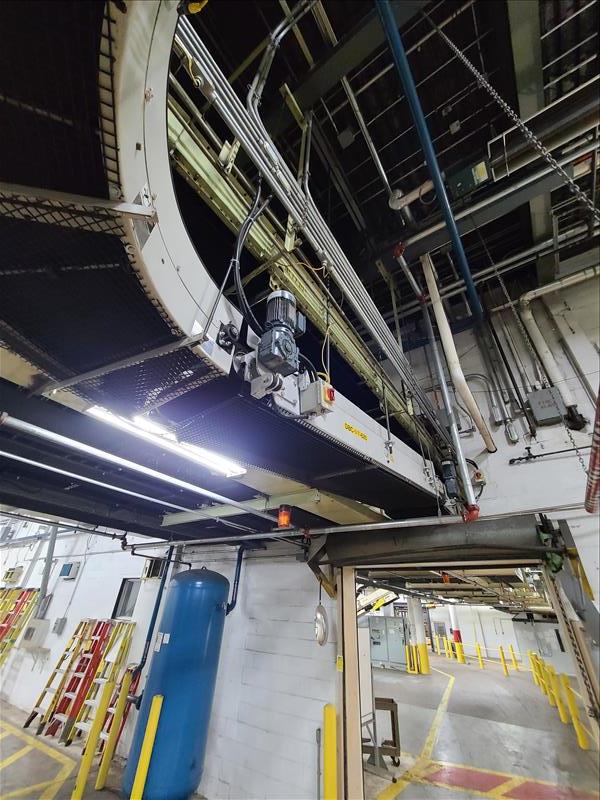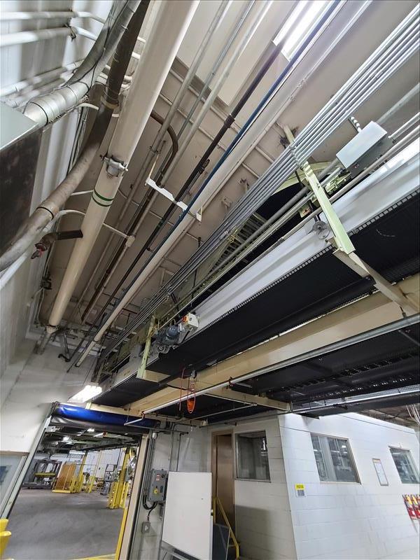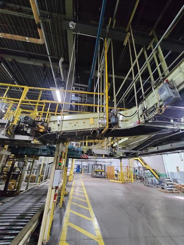 Power roller belt conveyor to palletizer, 102 ft l x 44 in w [Palletizing Line 3]