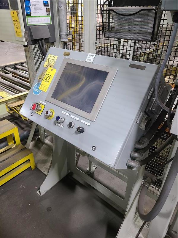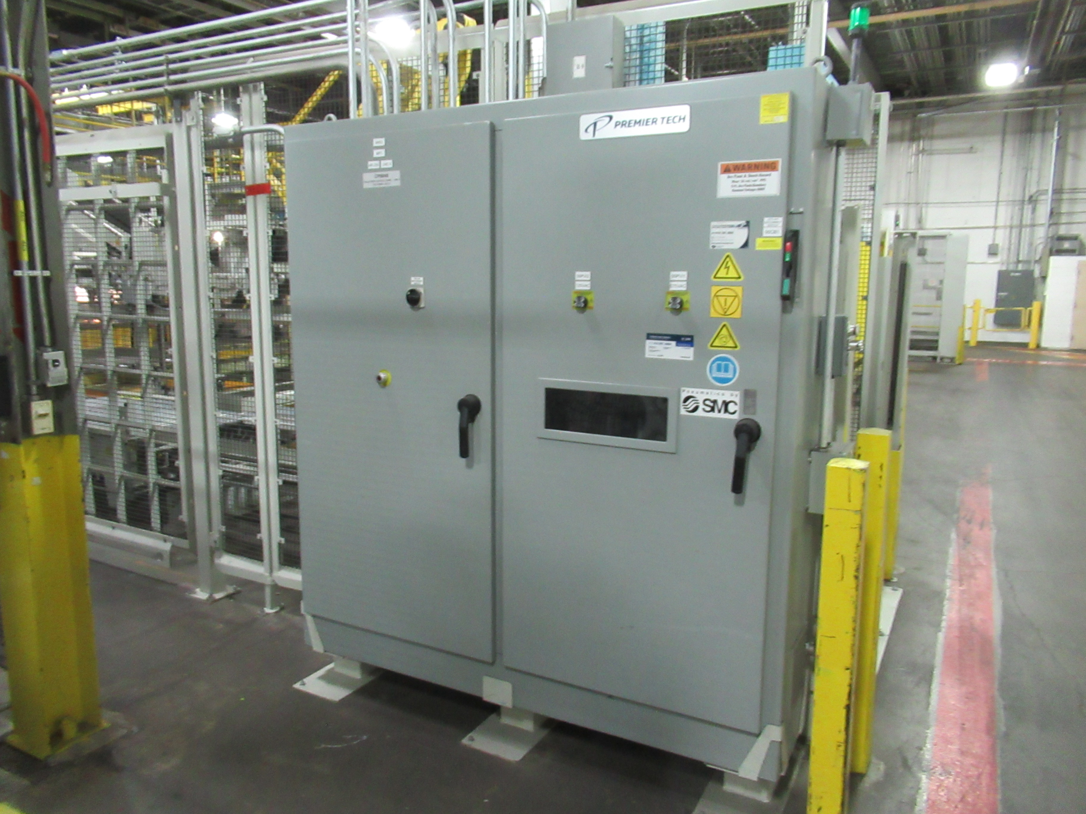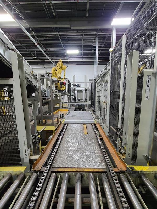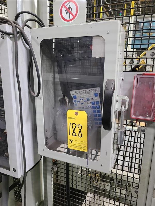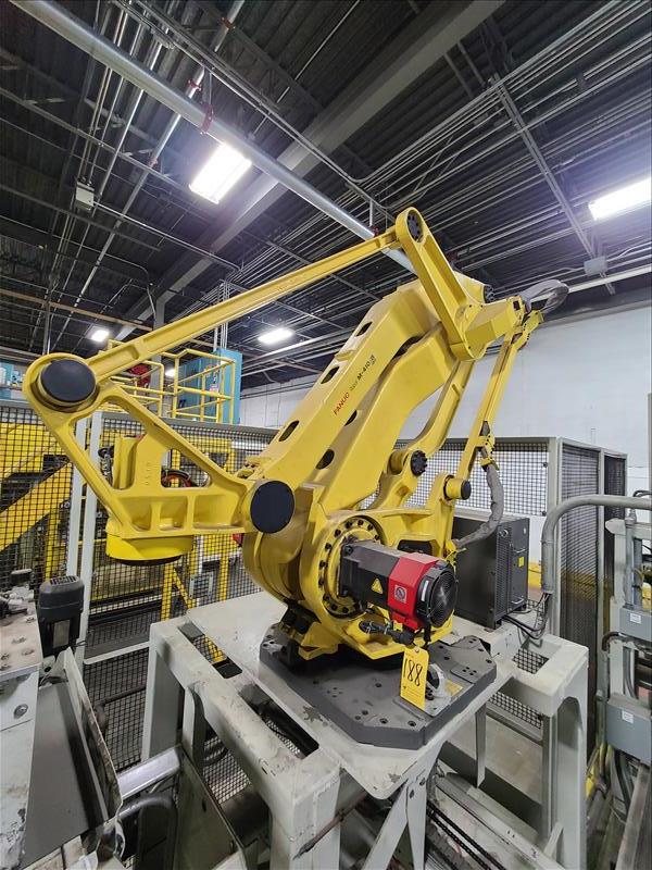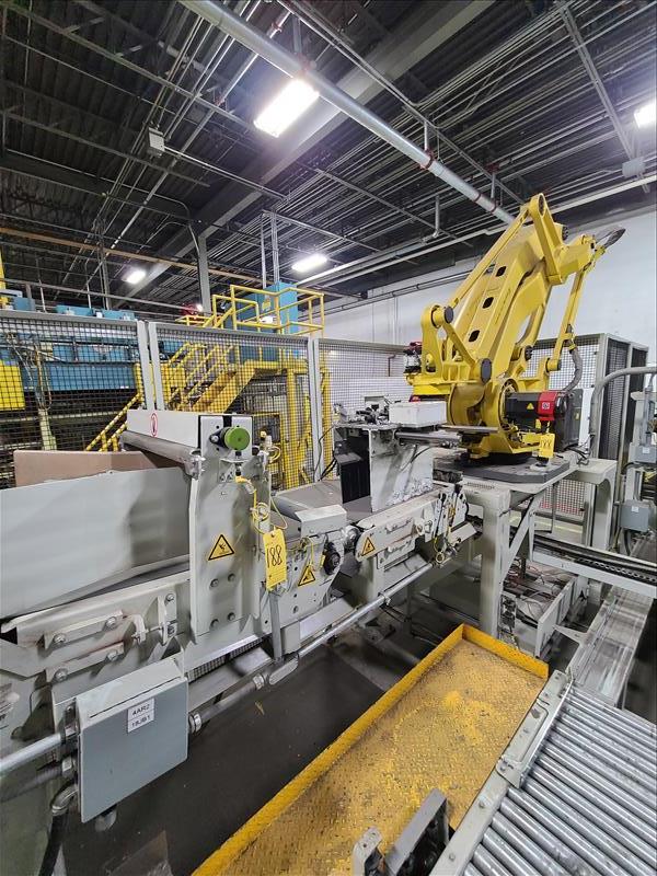 Premier Tech robotic palletizer, inclucdes Fanuc robot, mod M410IB160, (2010), 39 in w x 39 ft l discharge conveyor, with 14 in l x 43 in w roller conveyor [Palletizer 4]