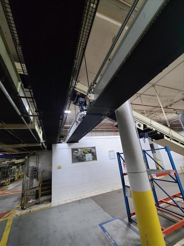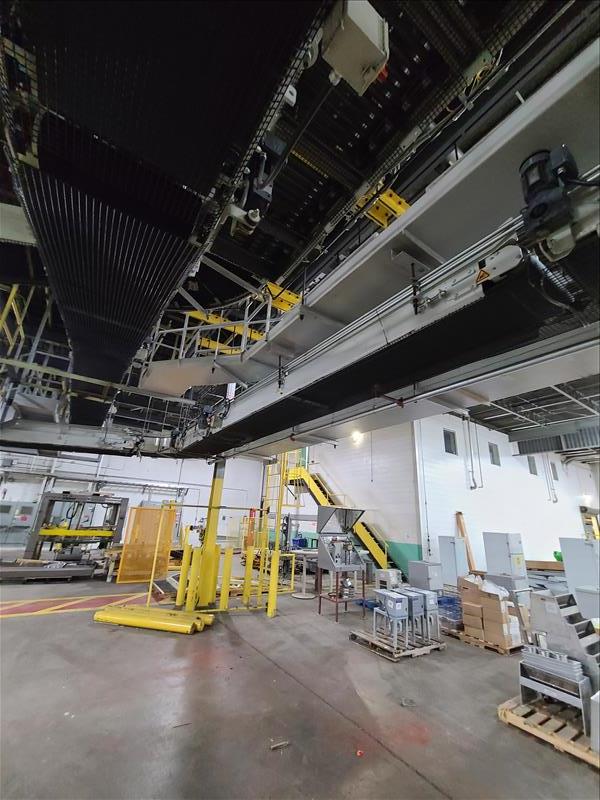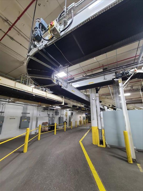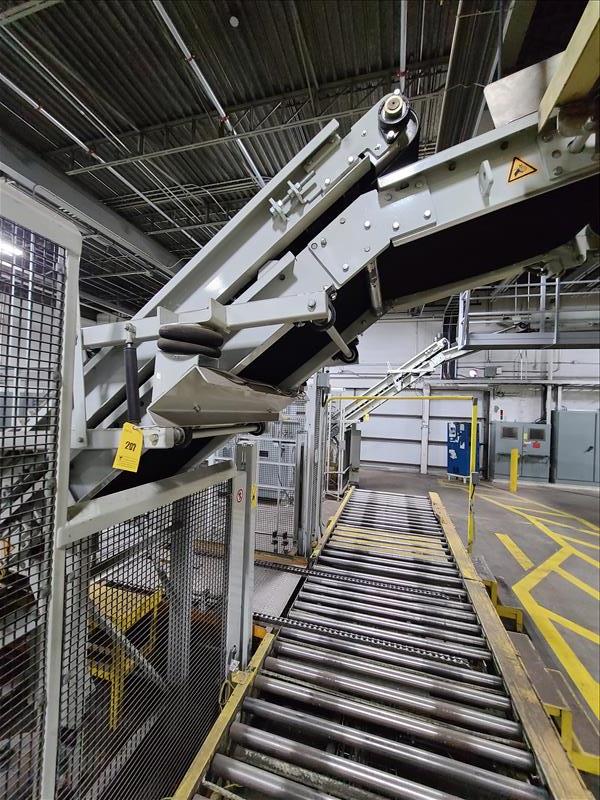 Power roller belt incline conveyor to robot palletizer, 235 ft l x 24 in w [Packaging Line 7]