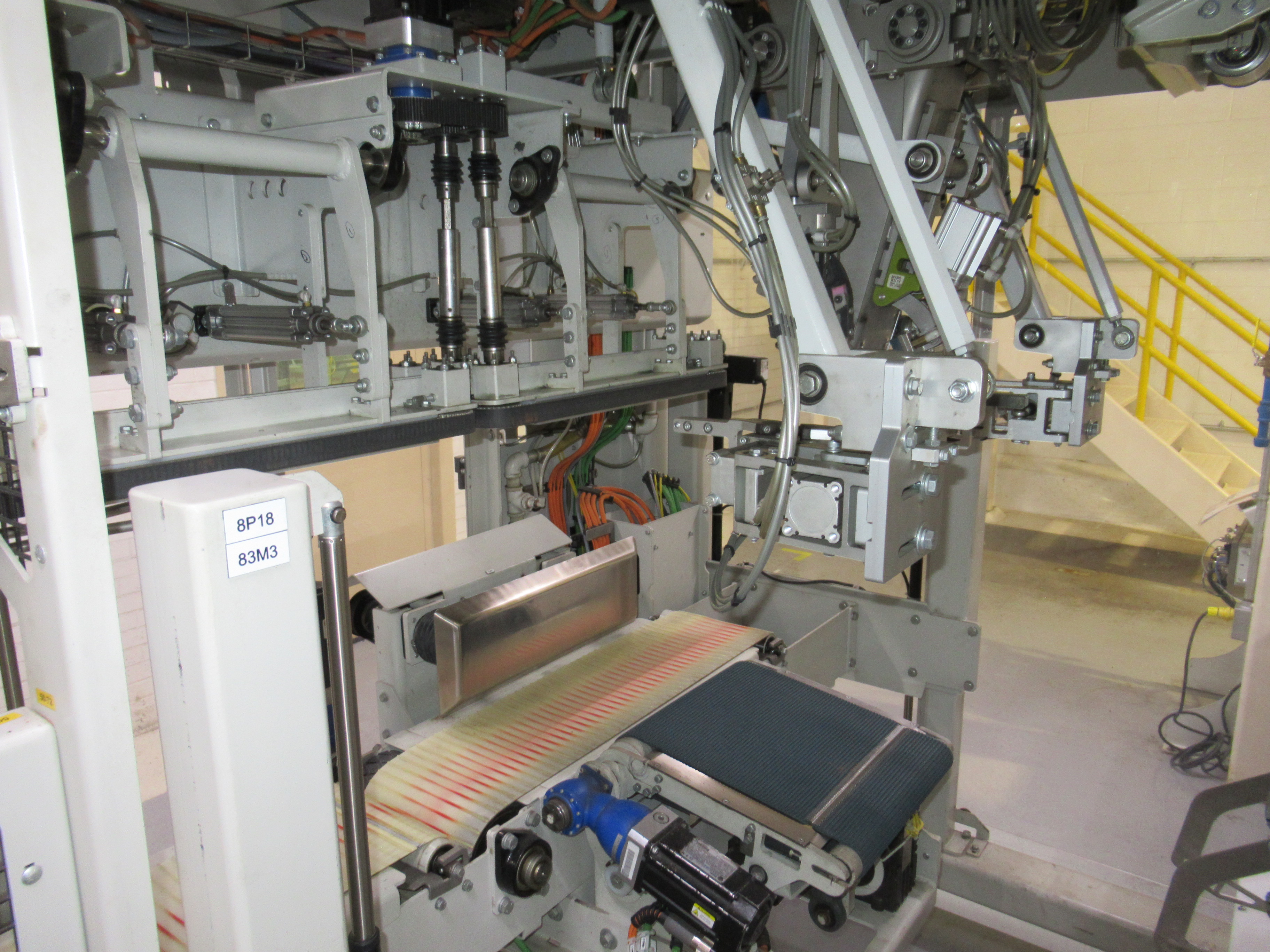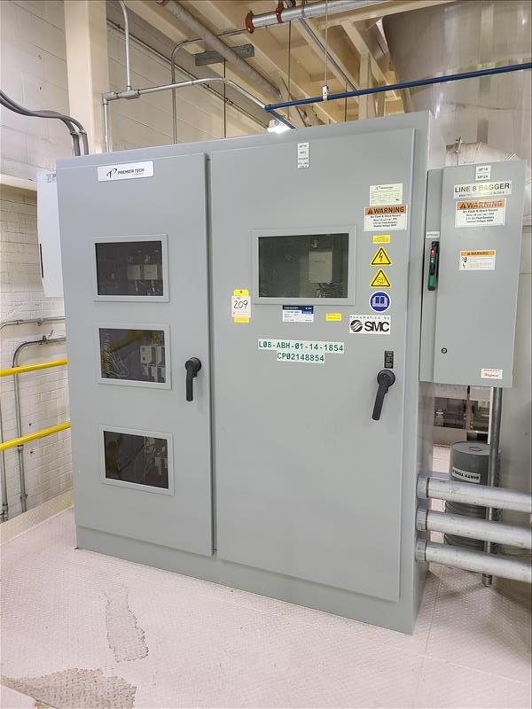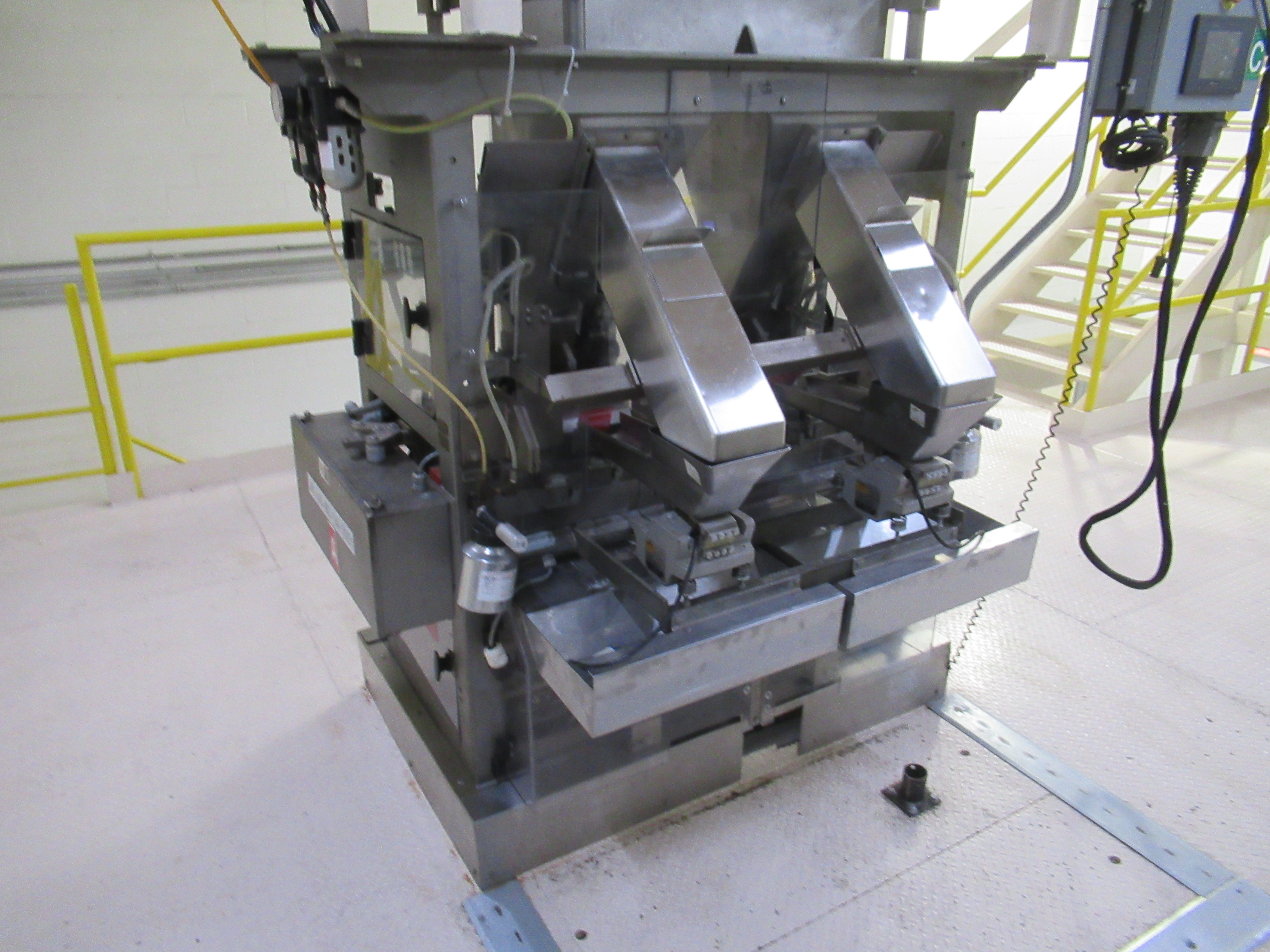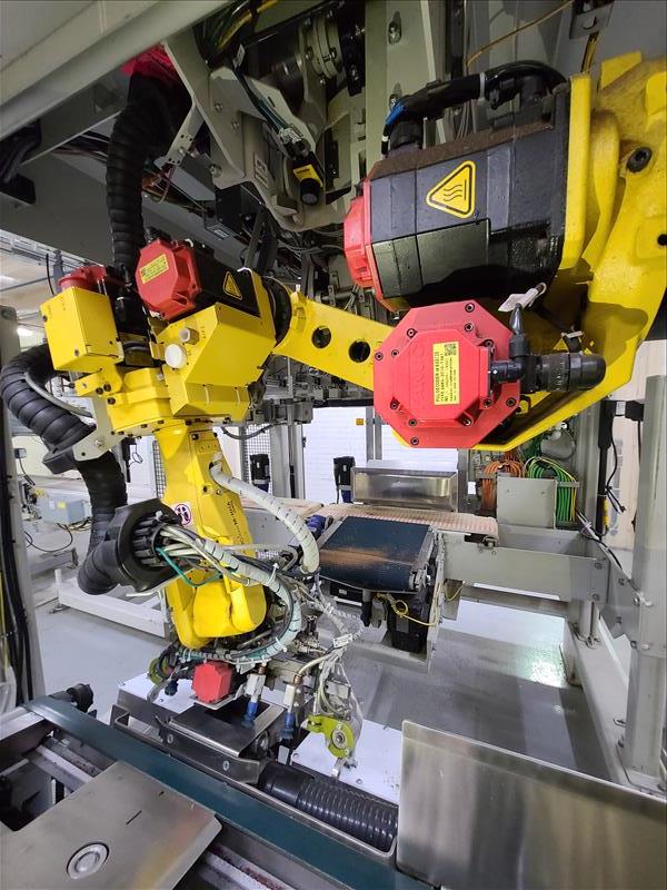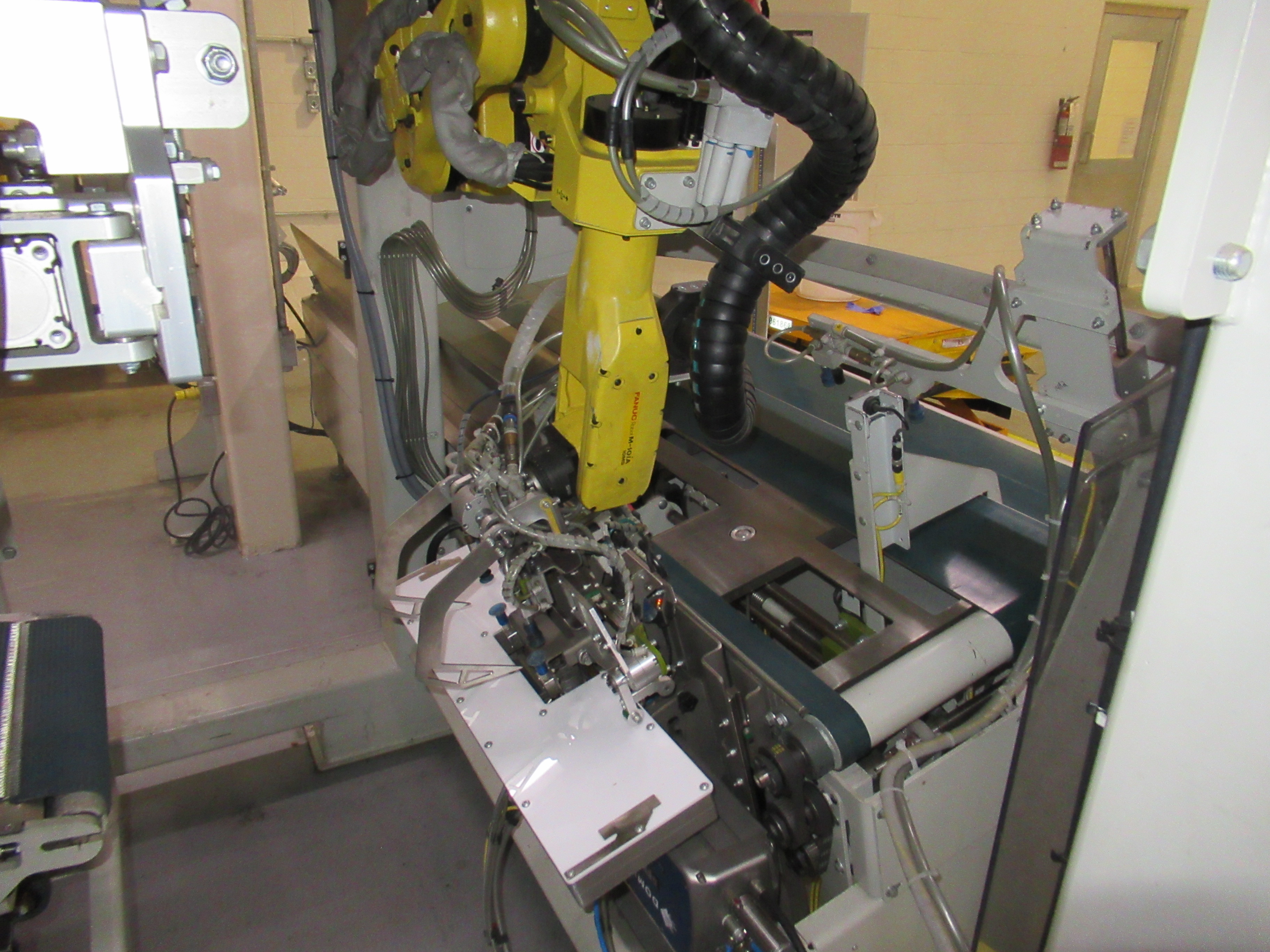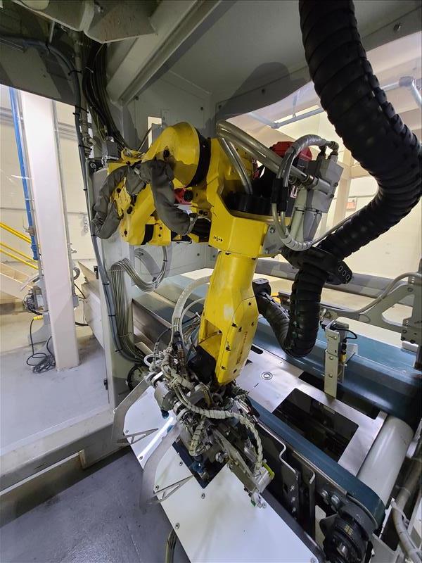 Fanuc robotic bag system, mod R31B, s/n 13931165, with Parsons 2 lane weigh scale filler, mod EM4II, s/n 469P-1 (located on mezzanine), 2 lane bag conveyor, control panel, (1) 20 in w x 112 in l belt conveyor, (1) 20 in w x 120 in l discharge conveyor, (1) 16 ft w x 16 ft l belt conveyor with guide (mfg 2013) [Packaging Line 8]