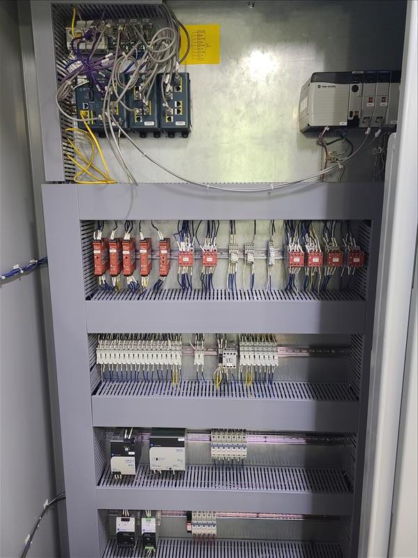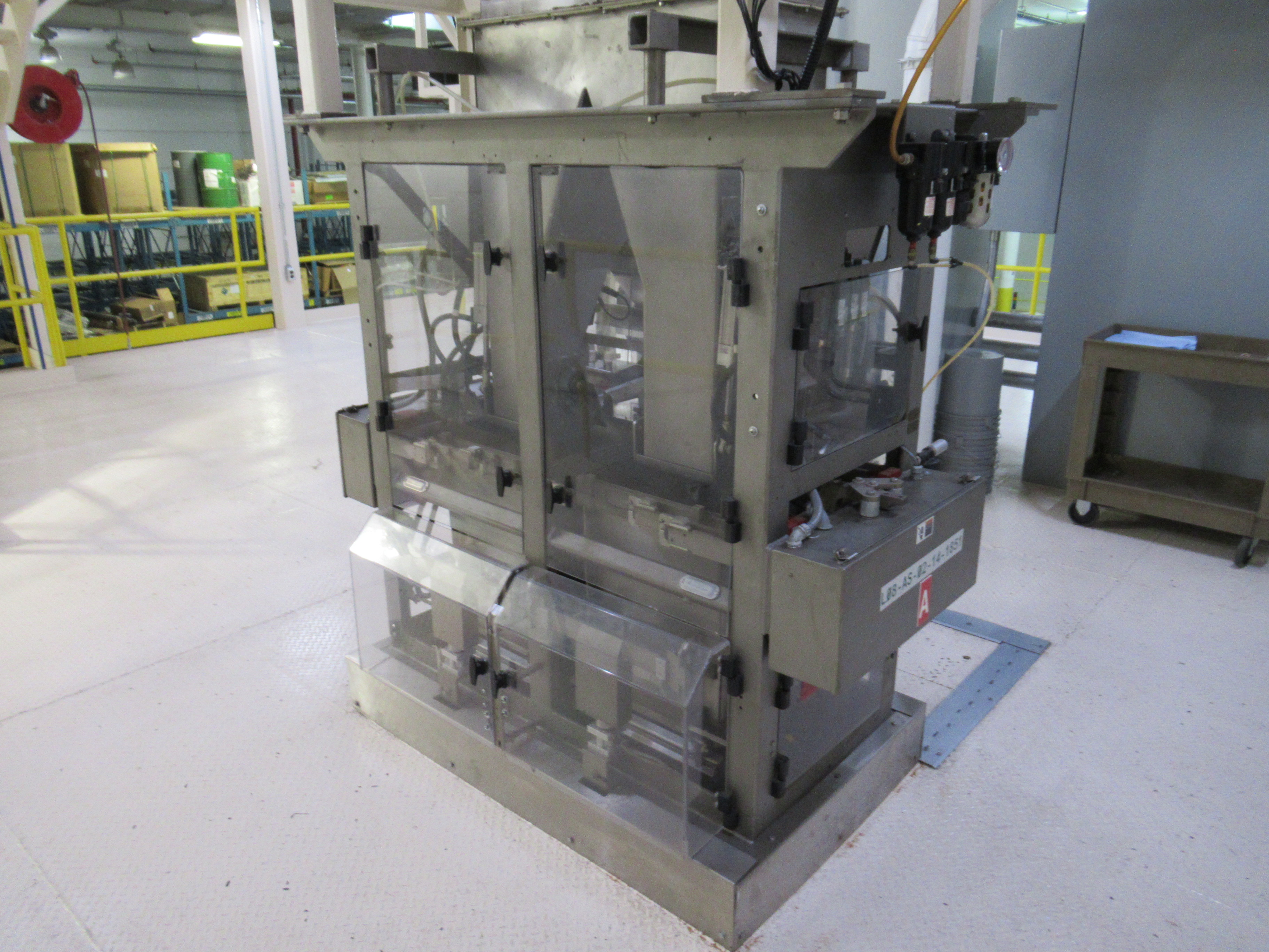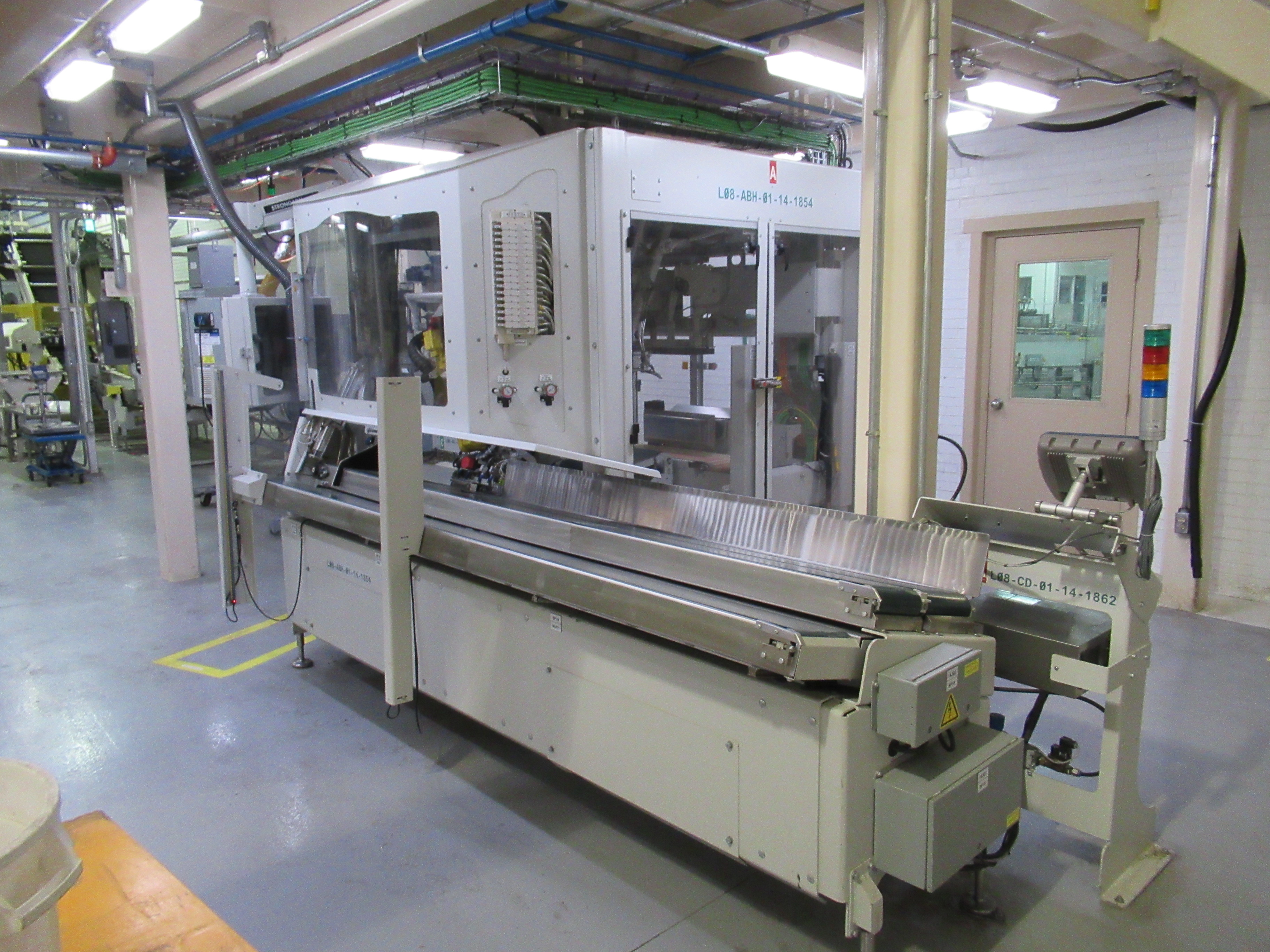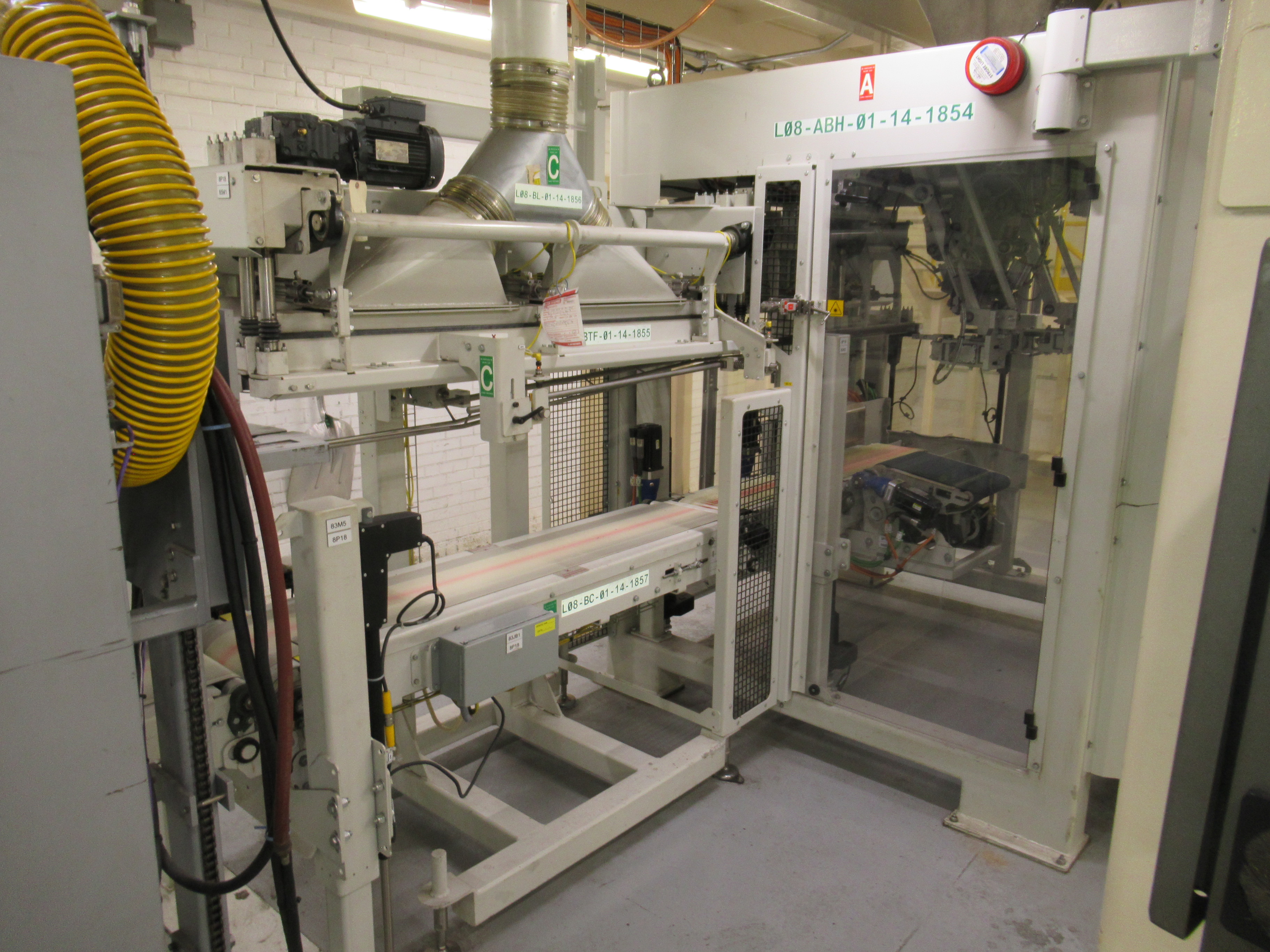 Fanuc robotic bag system, mod R31B, s/n 13931165, with Parsons 2 lane weigh scale filler, mod EM4II, s/n 469P-1 (located on mezzanine), 2 lane bag conveyor, control panel, (1) 20 in w x 112 in l belt conveyor, (1) 20 in w x 120 in l discharge conveyor, (1) 16 ft w x 16 ft l belt conveyor with guide (mfg 2013) [Packaging Line 8]