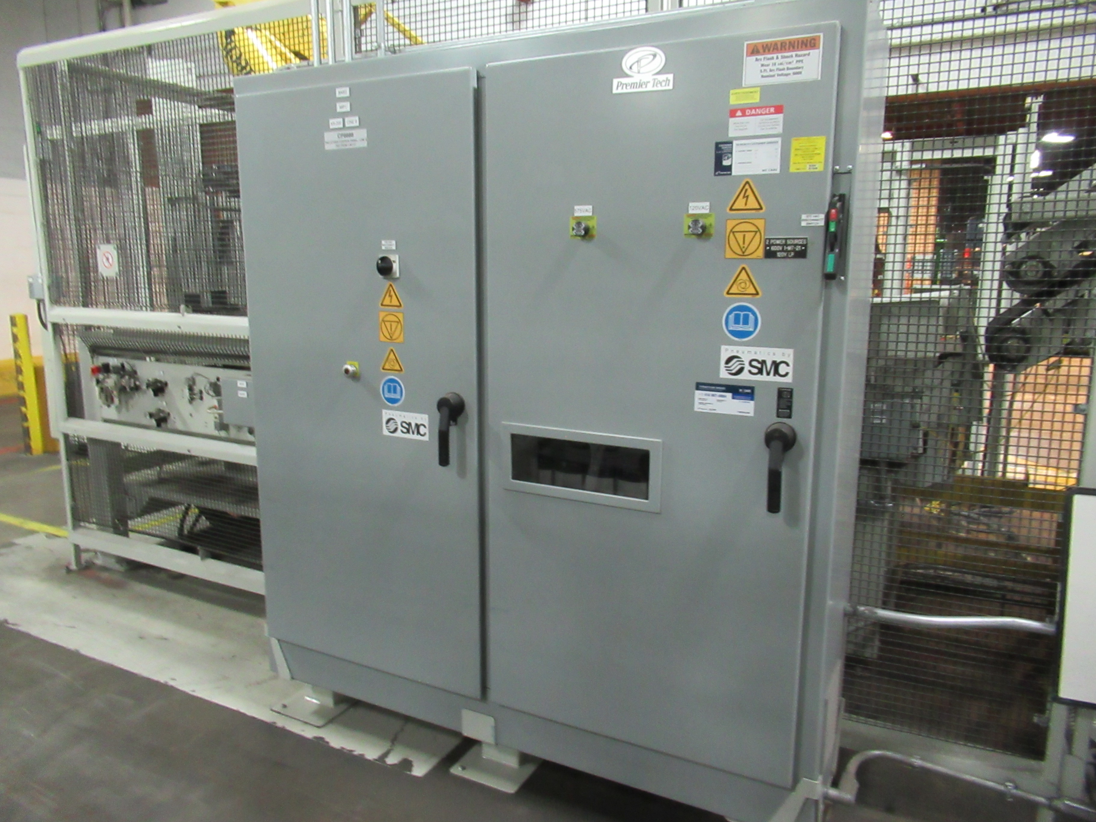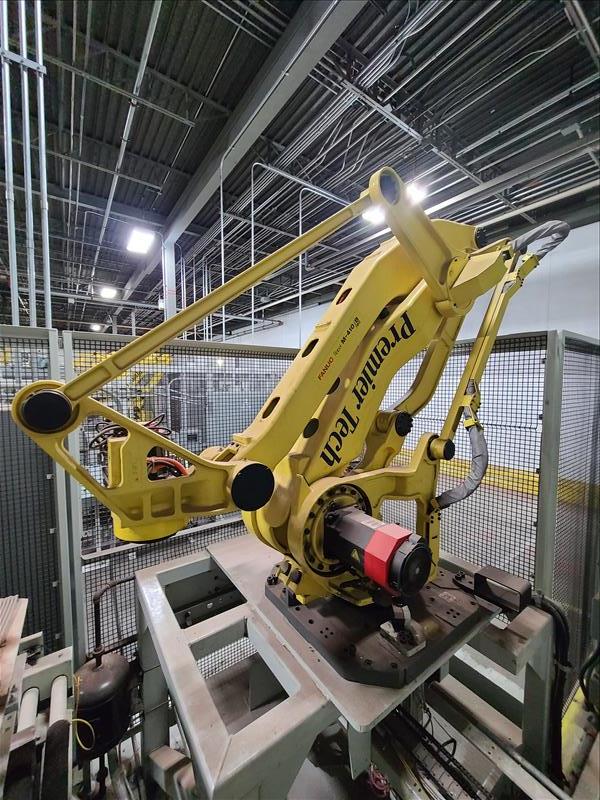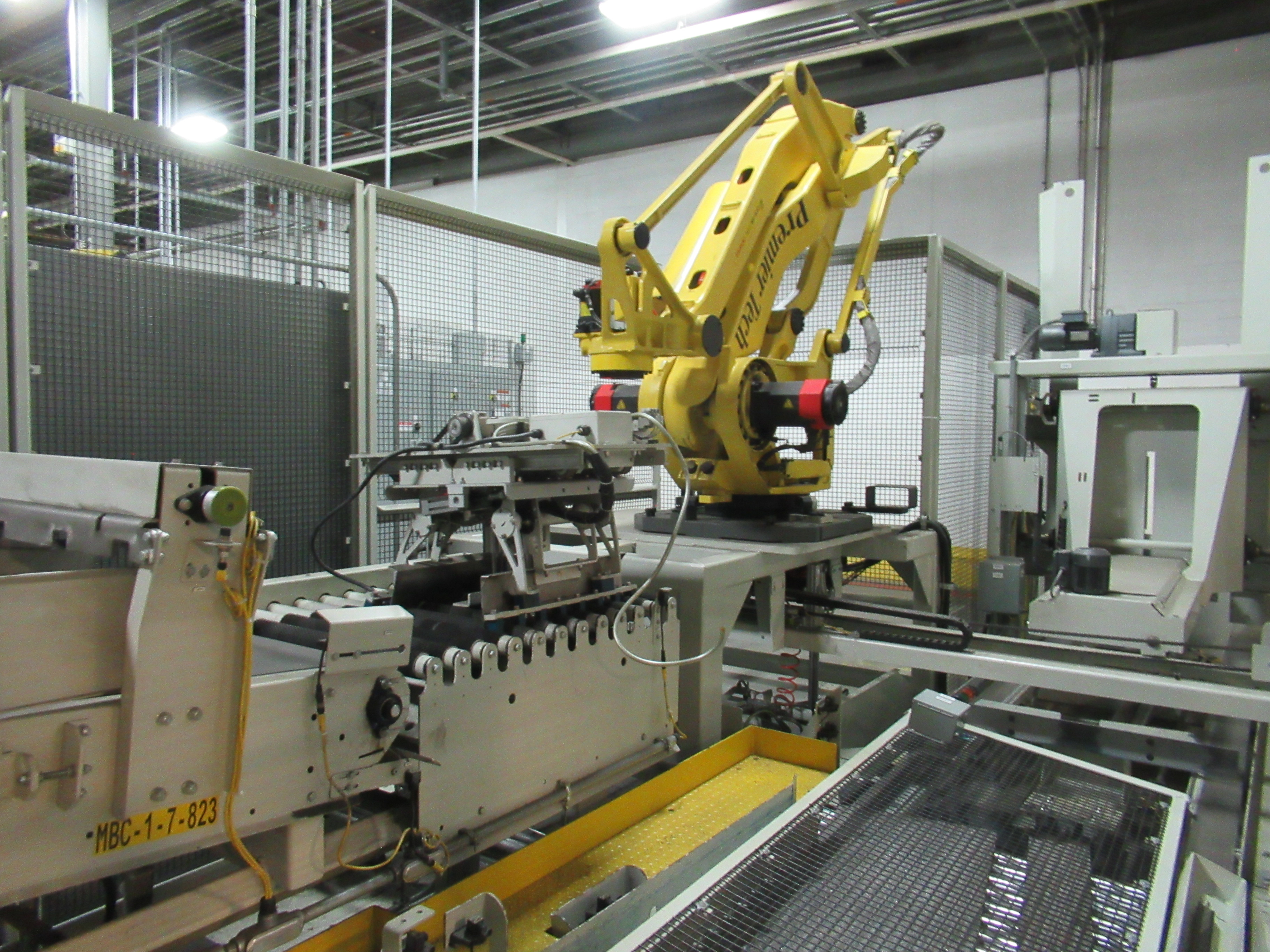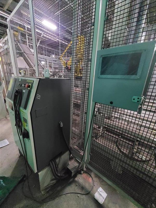 Fanuc robot palletizer, mod M410IB160, s/n 201406, with pallet infeed push type, hand controller, roller conveyor discharge [Palletizing Line 8]