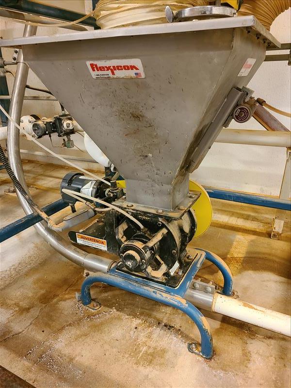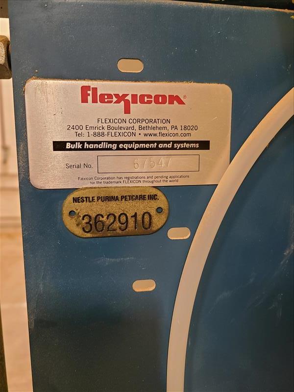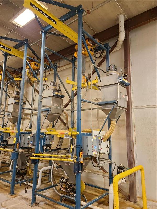 Flexicon bulk bag handling system, mod 67547, s/n 362910, with stainless hopper, rotary valve dust collector system, Kito jib arm with 2 ton electric chain hoist, 4000 lbs. cap. [Back Warehouse]