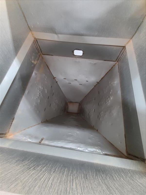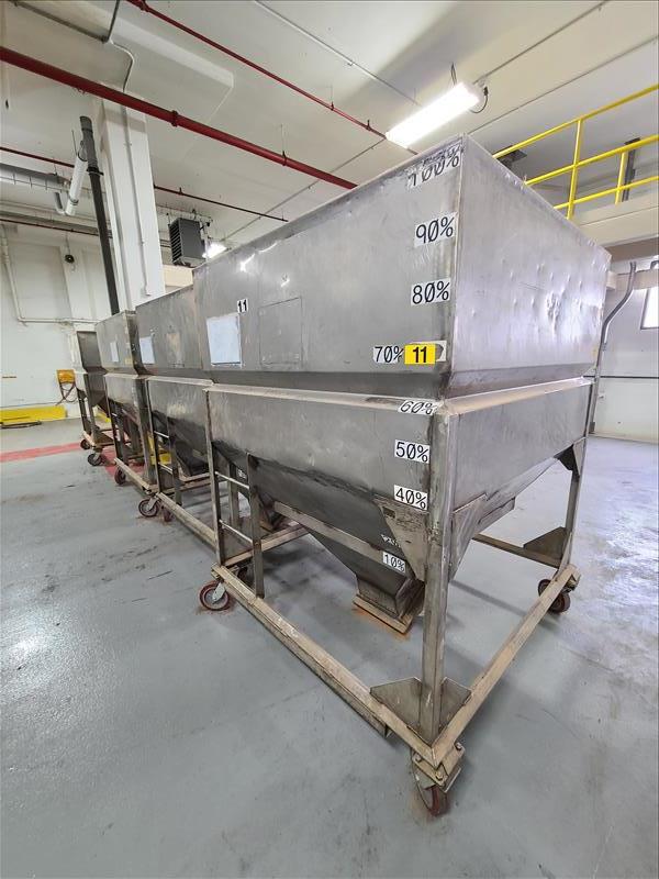 [LOT] (4) stainless product hopper bins, 67 in h x 5 ft w x 5 ft l, bottom slide gate, mobile [Packaging Area, 2nd Floor]