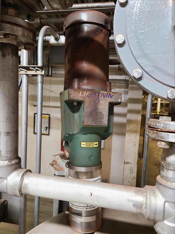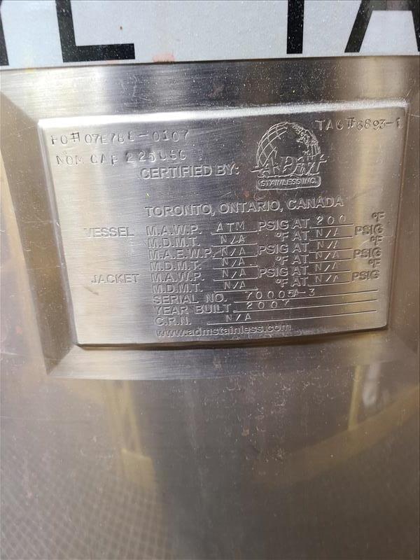 ADM stainless mix tank, s/n 7005-A3, with lightning agitator, 48 in straight side, 35 in diameter, 225 gal. cap., (2007) [Dryer Area]