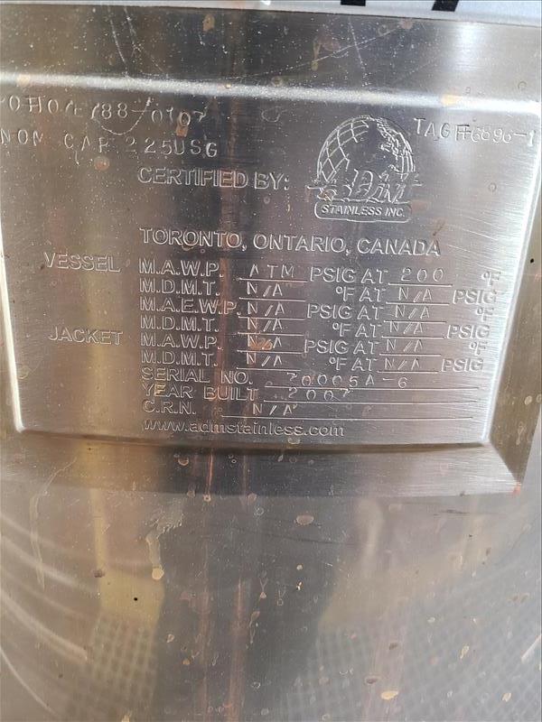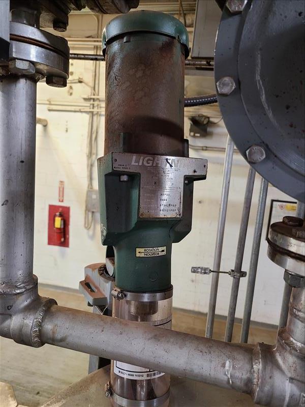 ADM stainless mix tank, s/n 7005-A6, with lightning agitator, 48 in straight side, 35 in diameter, 225 gal. cap., (2007) [Dryer Area]