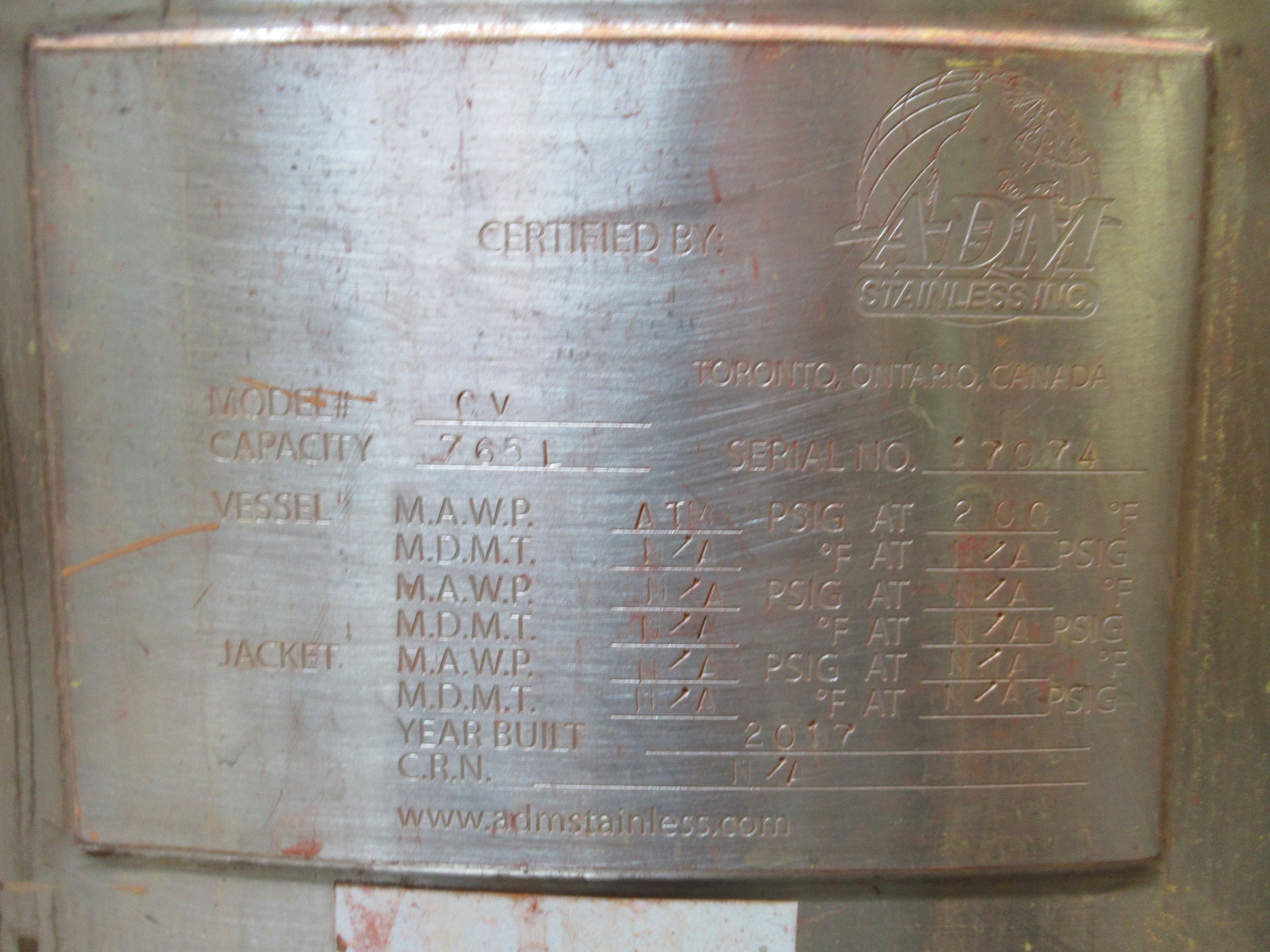 ADM stainless mix tank, s/n 17074, with lightning agitator, 28 in straight side, 40 in diameter, 200 gal. cap. [Dryer Area]