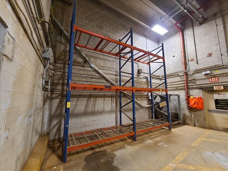 [LOT] 2 section pallet rack, with (3) 16 ft 8 in x 44 in w upright, (12) 8 ft cross bar, wire shelving [Back Warehouse]
