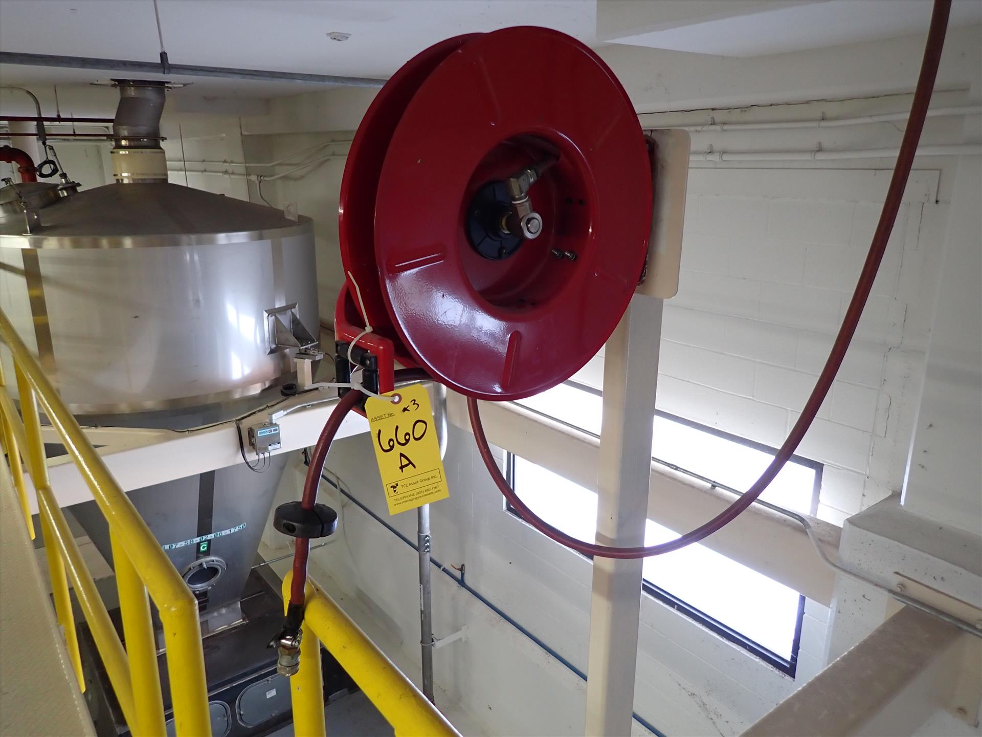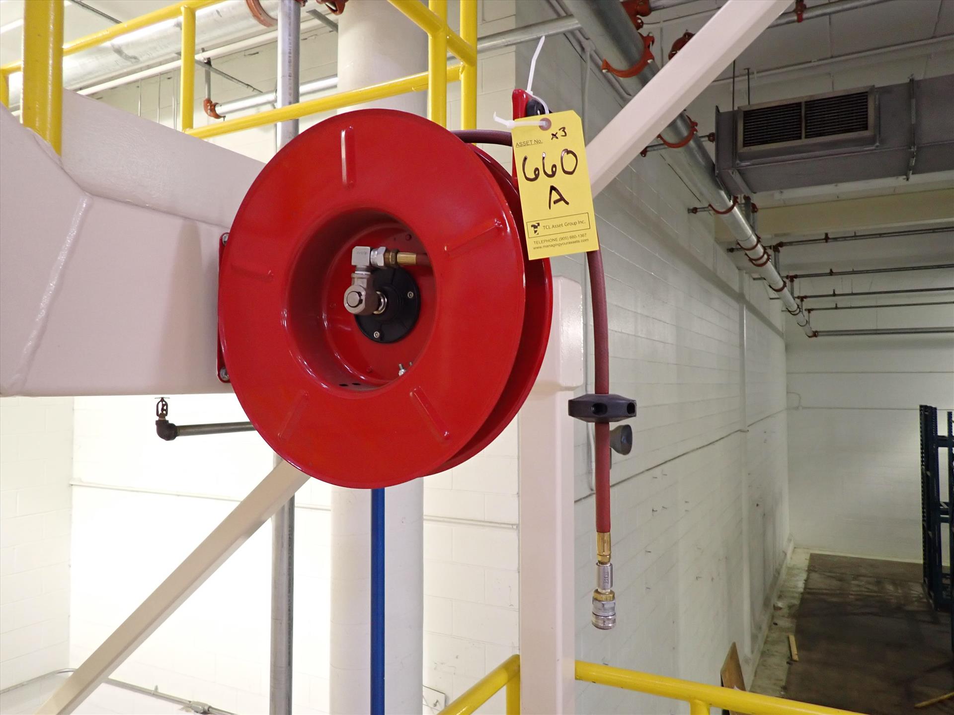 LOT (3) hose reels mounted, Located in packaging areas and 2nd floor