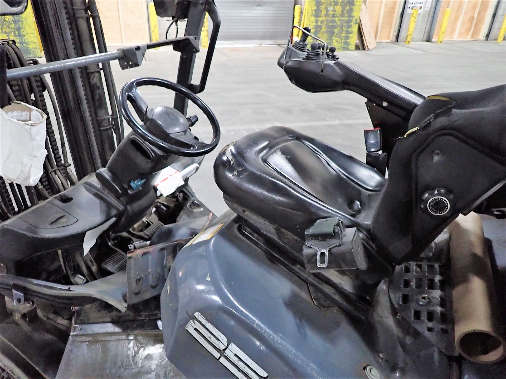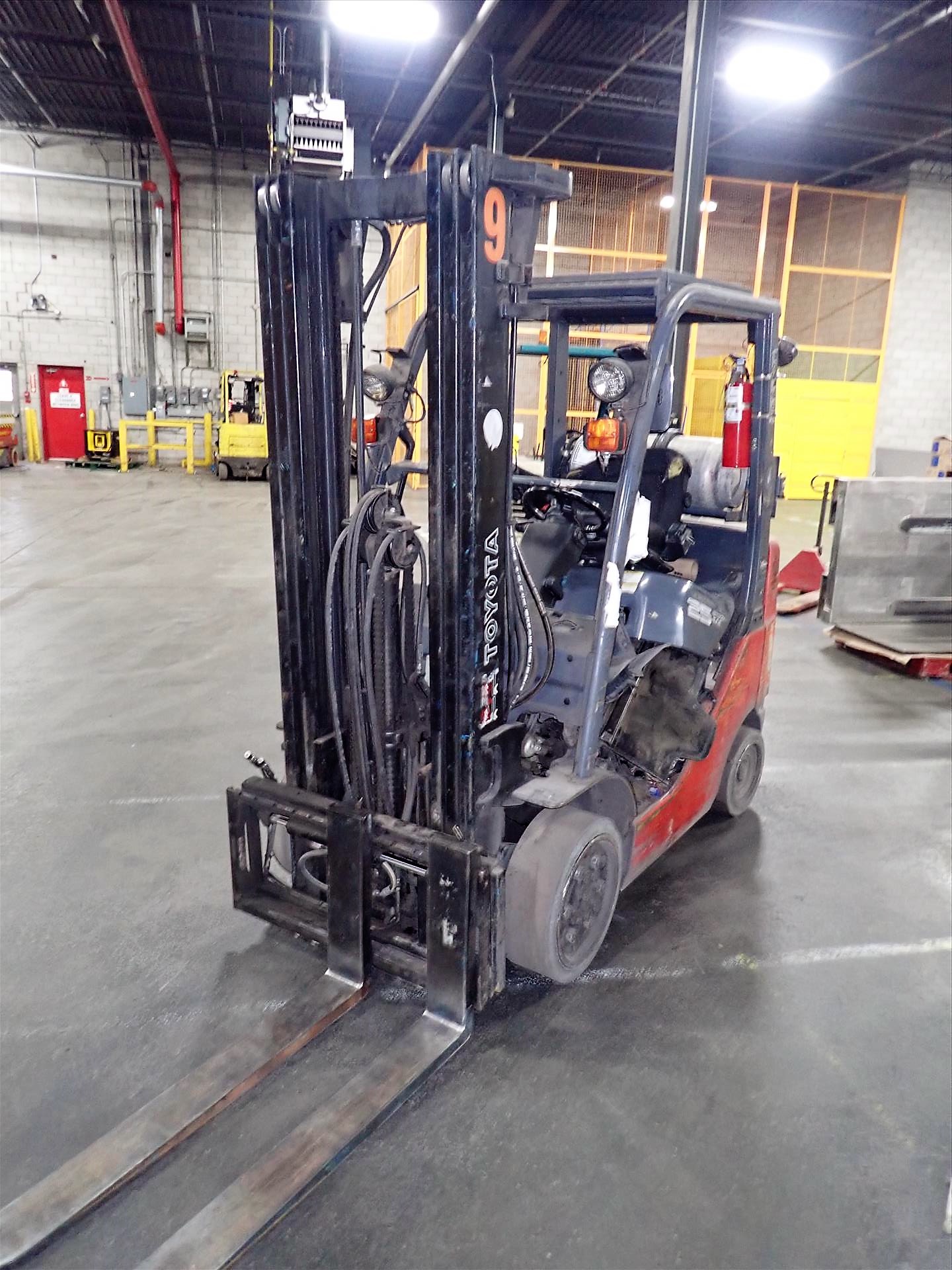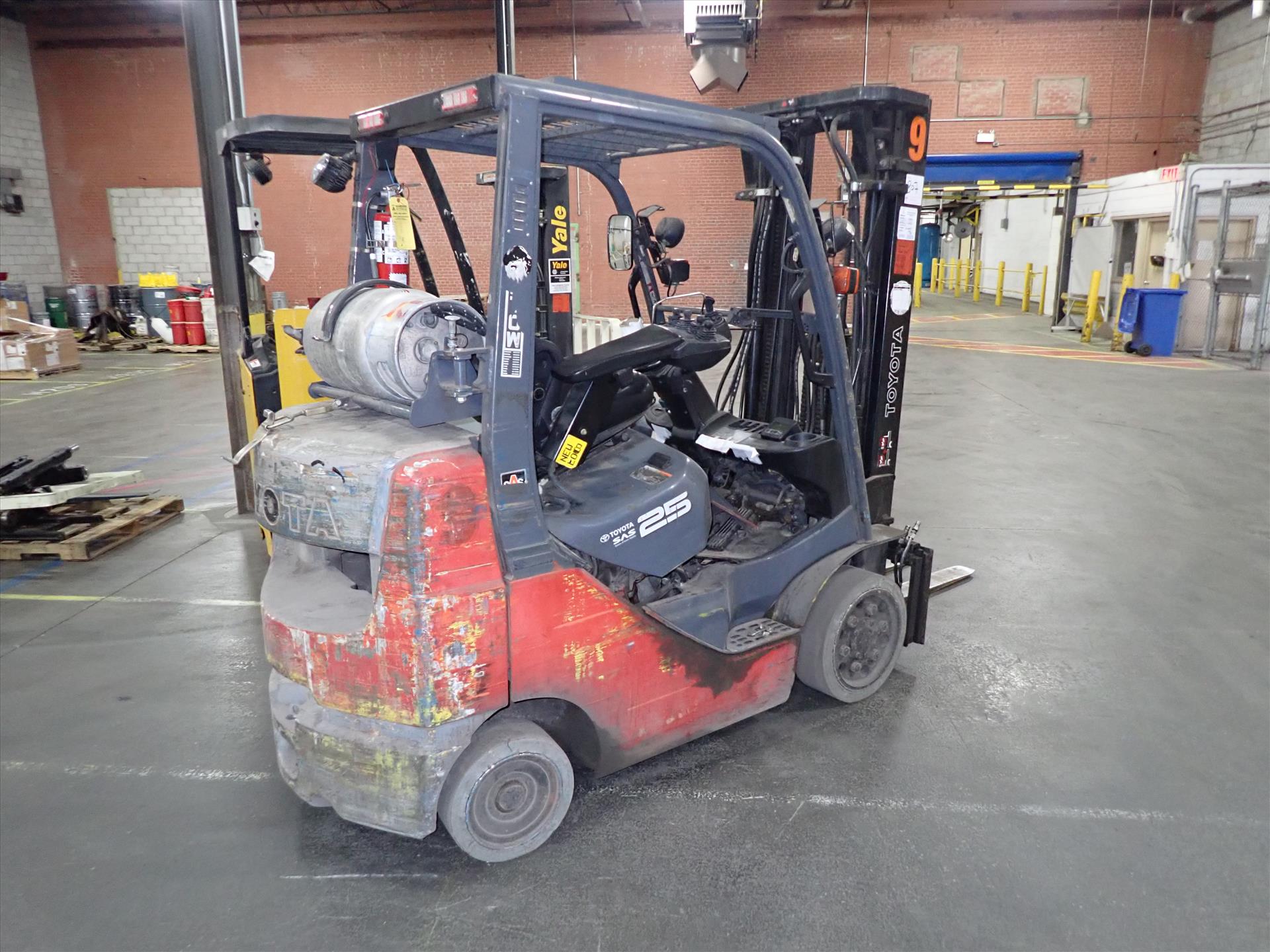 Toyota counter weight fork lift truck, mod. 8FGCU25, ser. no. 11714, LPG, 4500 lbs. cap., 198 in lift height, 3-stage mast, side shift, cushion tires (requires repair) [Receiving]