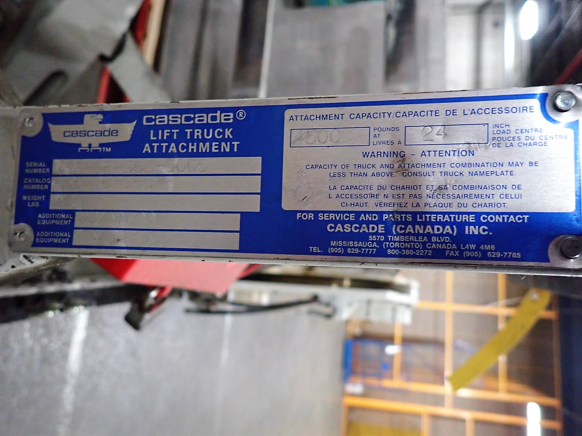 Cascade sheeter fork lift attachment, mod. 45E-QB-065, S/N 45E-QB-065-00007, 1500 lbs. cap. [Receiving]