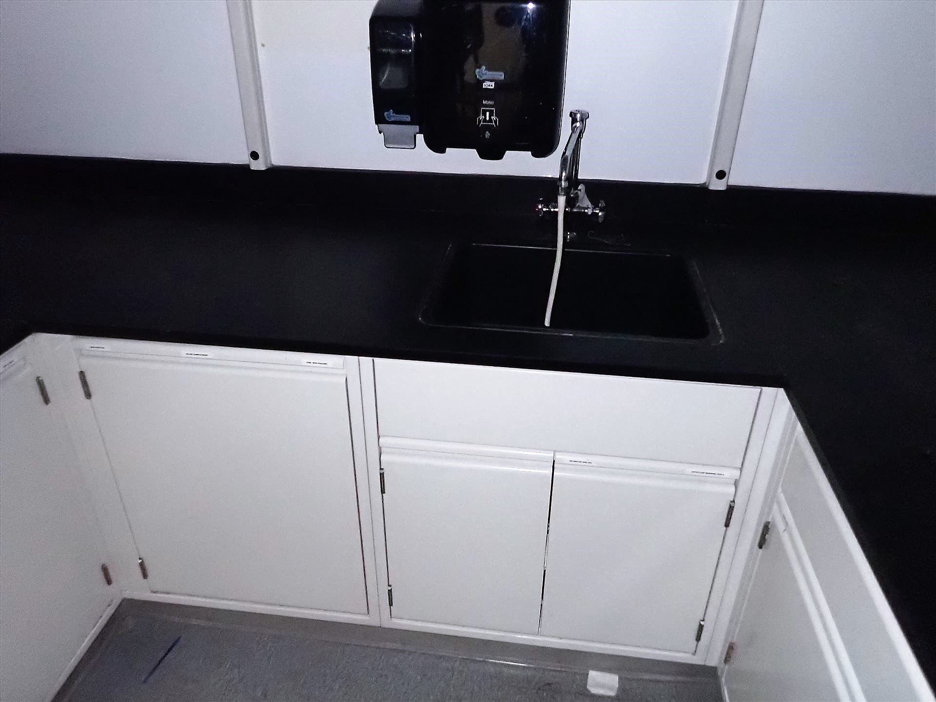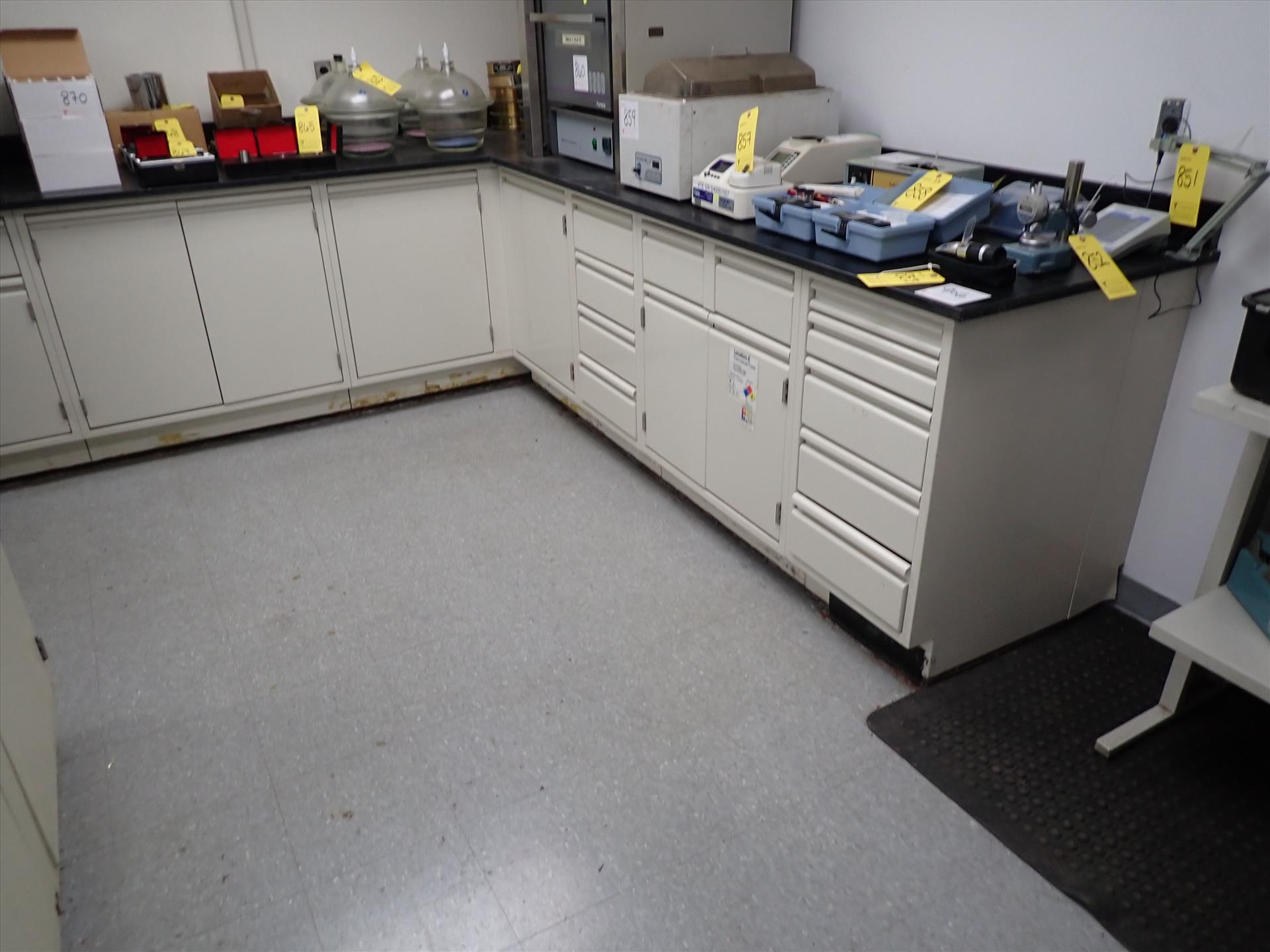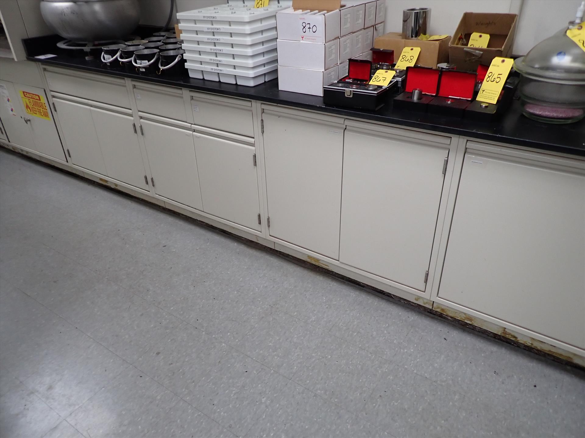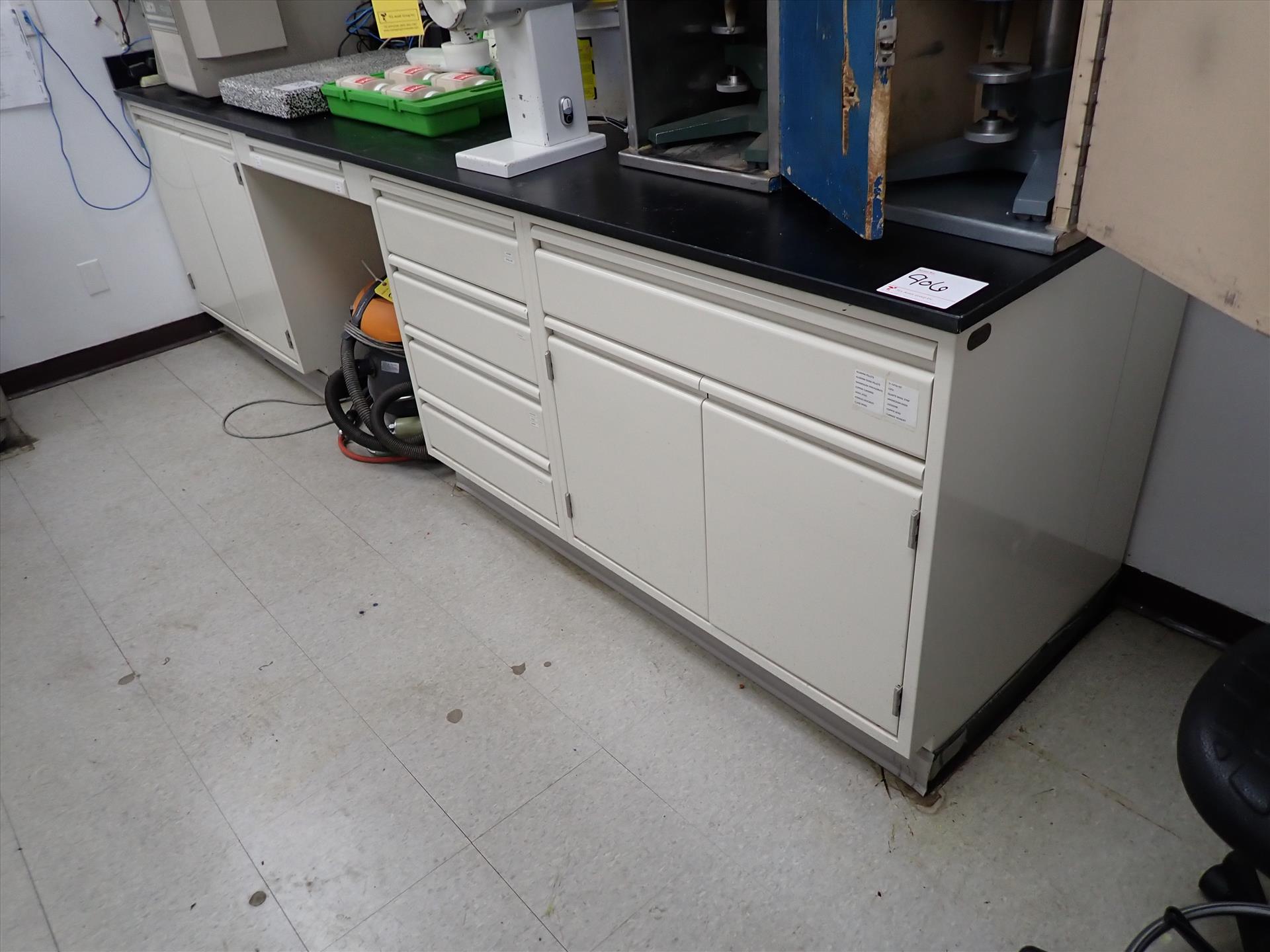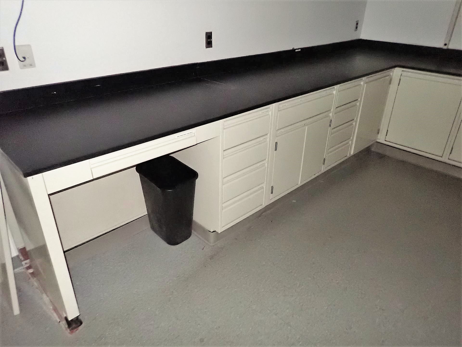 [LOT] (3 sec.) lab cabinets w/ upper/lower cabinets, slate top, sink, 32 in x 84 in /116 in /128 in , 30 in x 90 in /162 in and 33 in x 128 in [Laboratory]