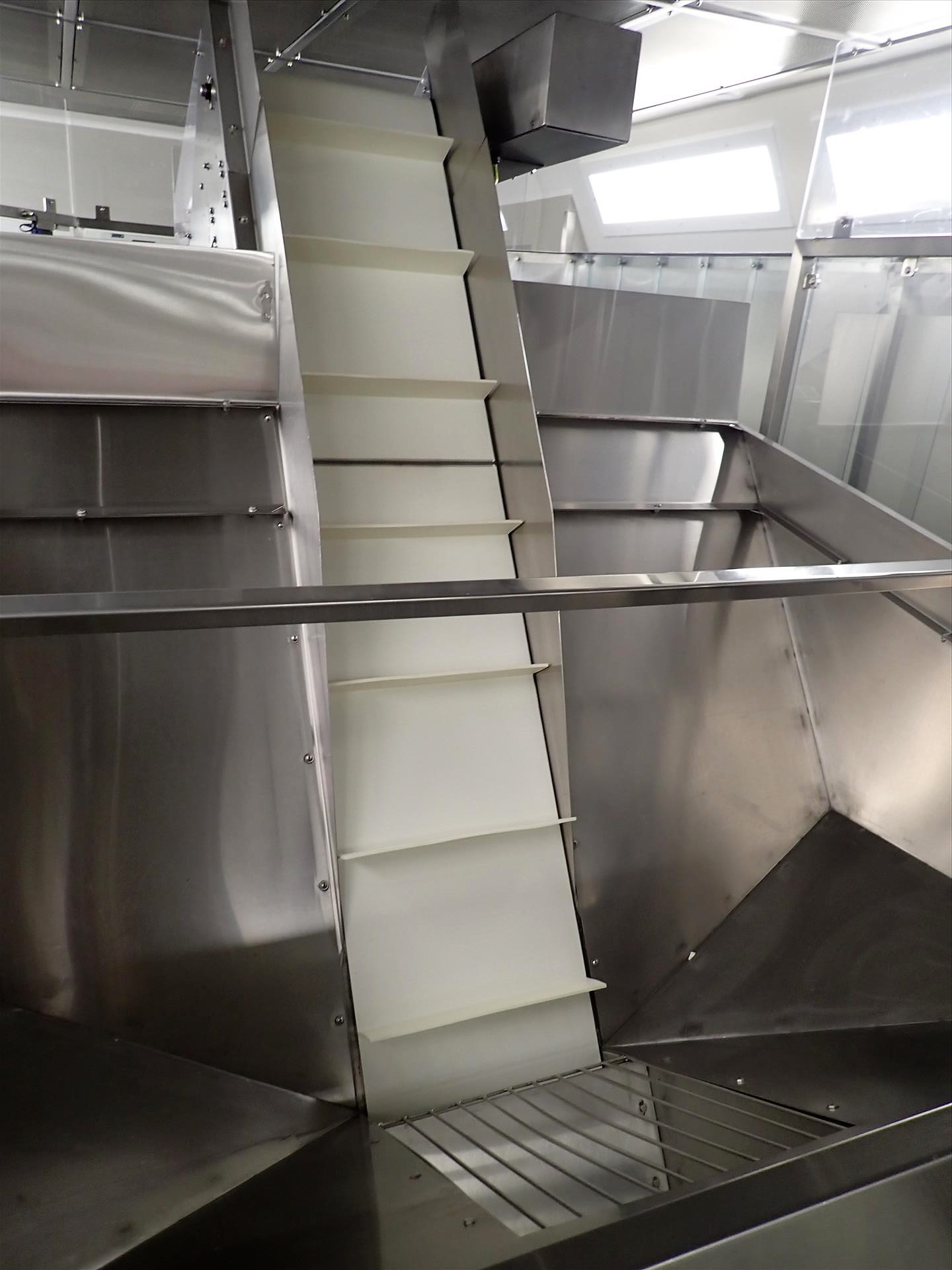 Hoppmann mod. EP bottle hopper elevator, s/s, 18 in. fluted belt, approx. 5 ft. x 6 ft. hopper, ser. no. 17116 (Subject to confirmation. The winner will be determined based on the sum of bids on lots 16-27A vs on bulk bid lot 15)