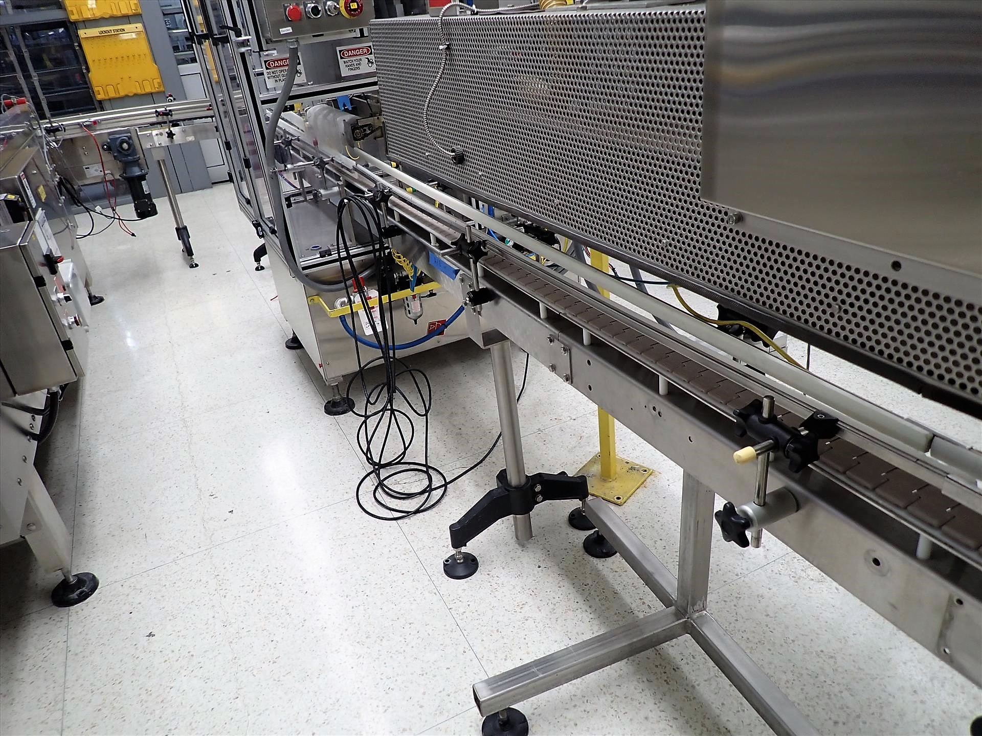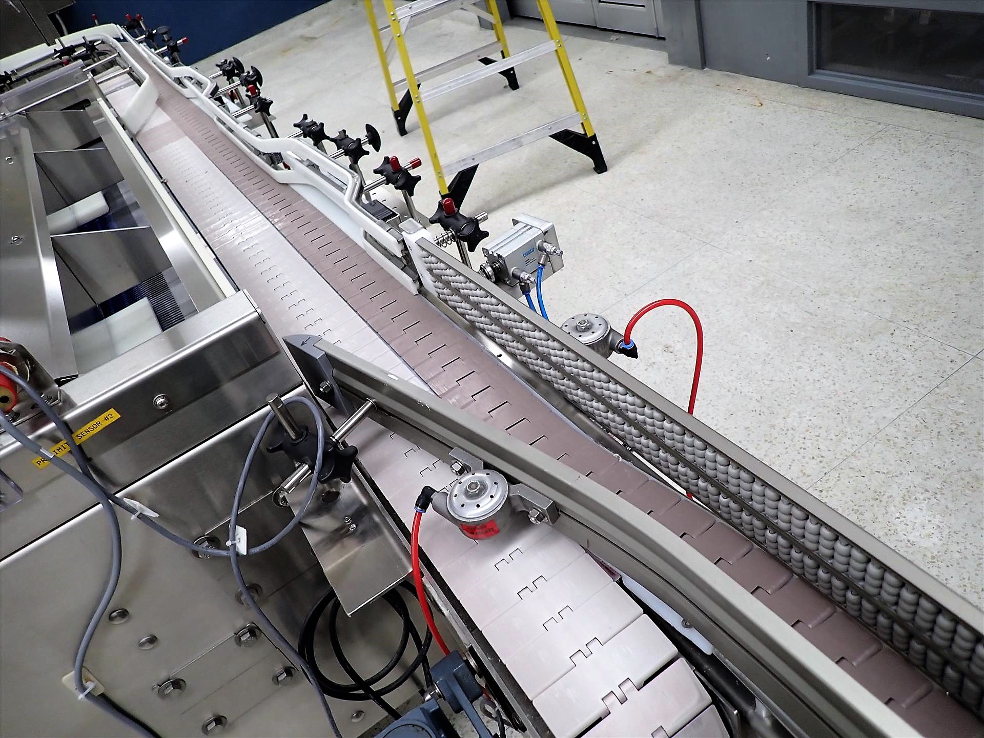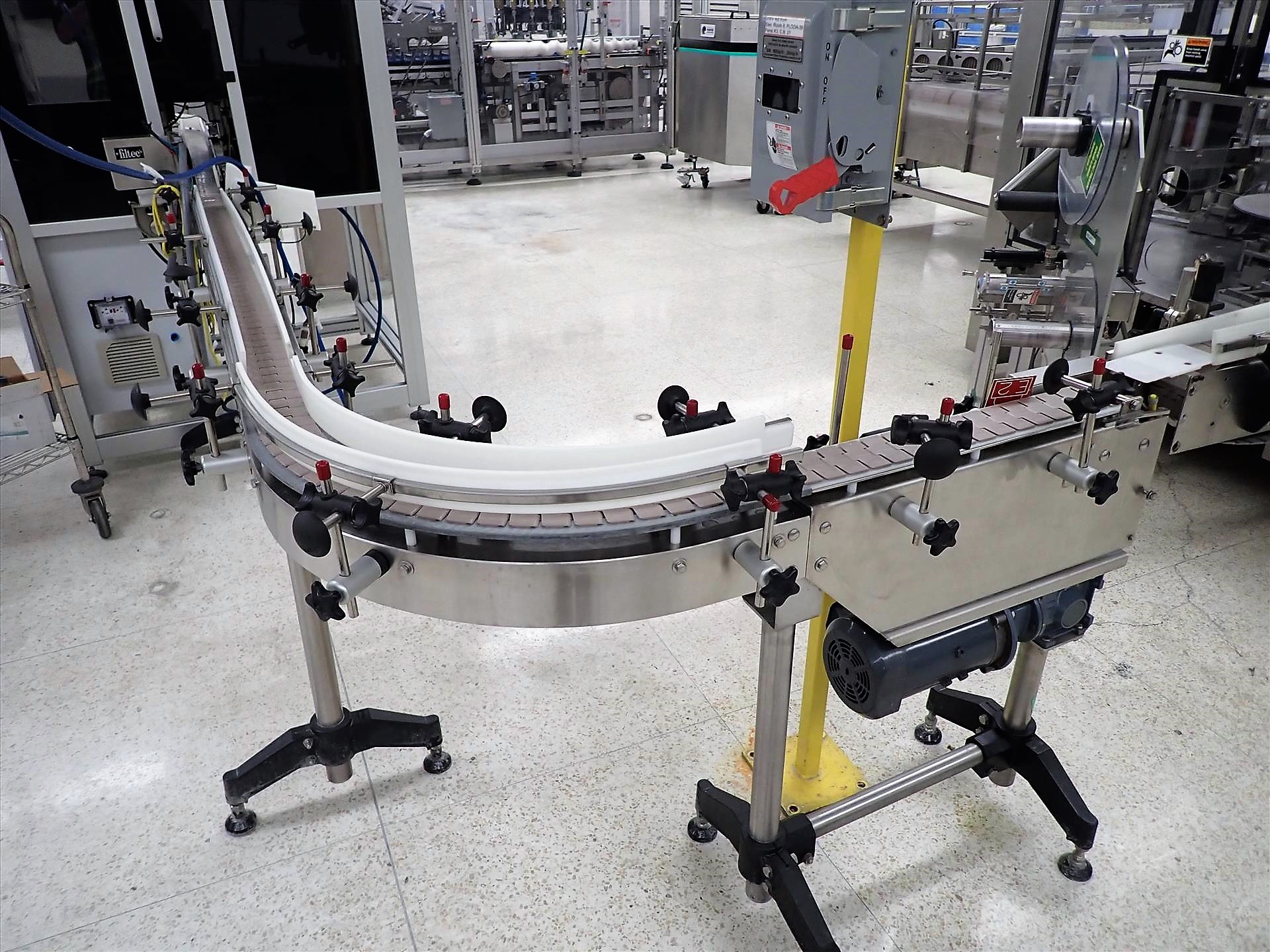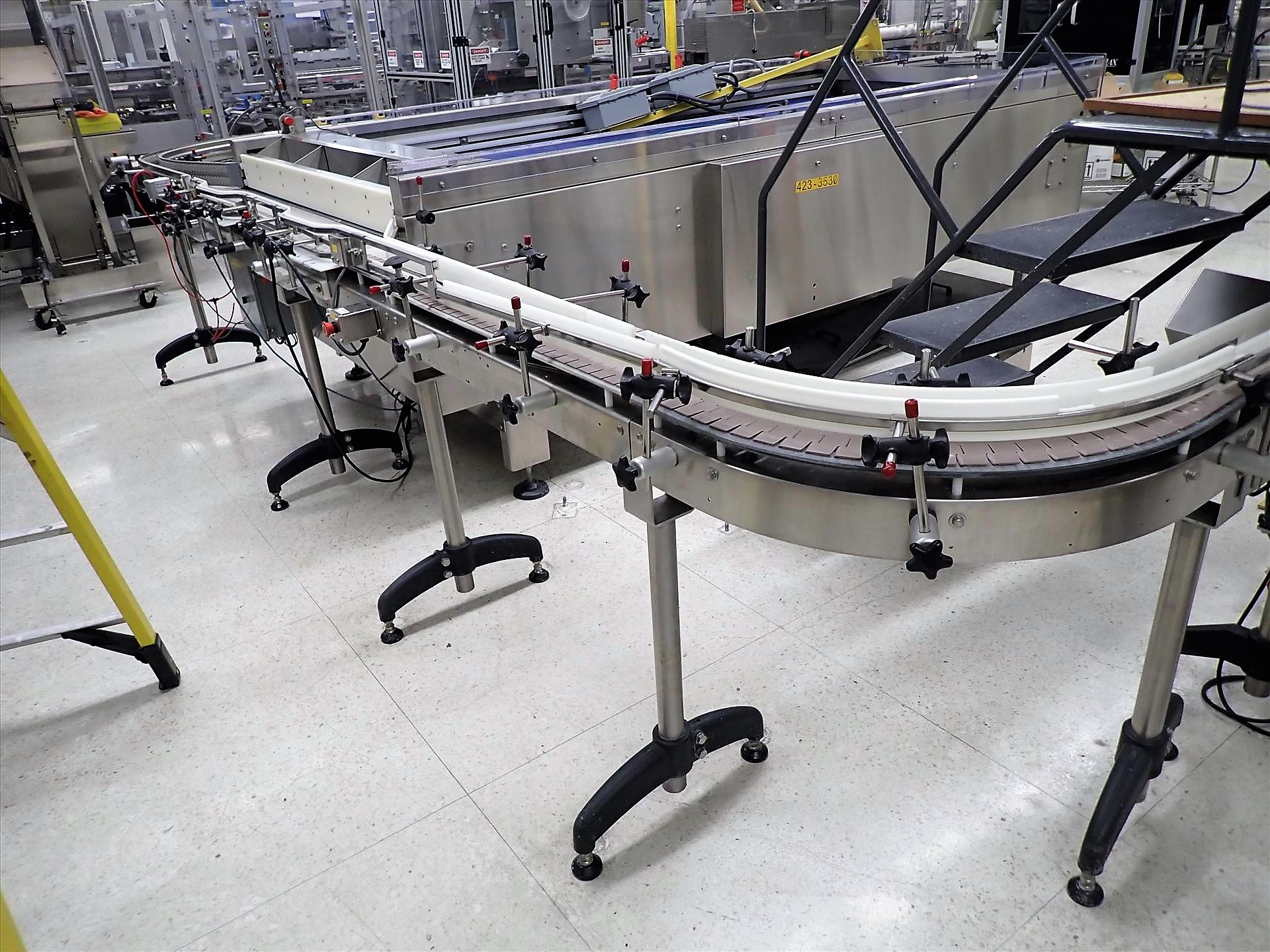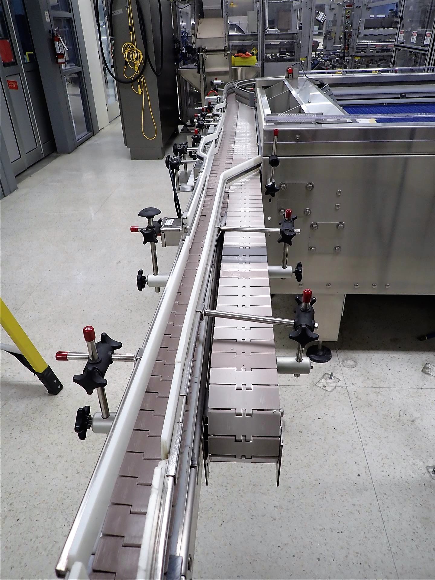 slat-top chain conveyor, s/s, approx. 3 in. x 80 ft., (5) 90 deg., power, VSD w/ 4.5 x 11 ft. additional section (Subject to confirmation. The winner will be determined based on the sum of bids on lots 29-41 vs on bulk bid lot 28)