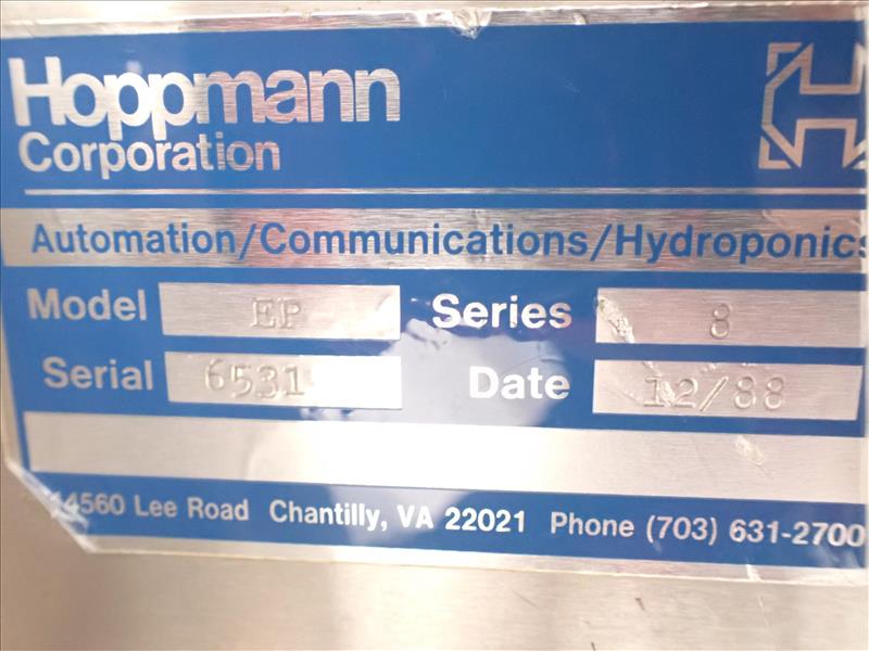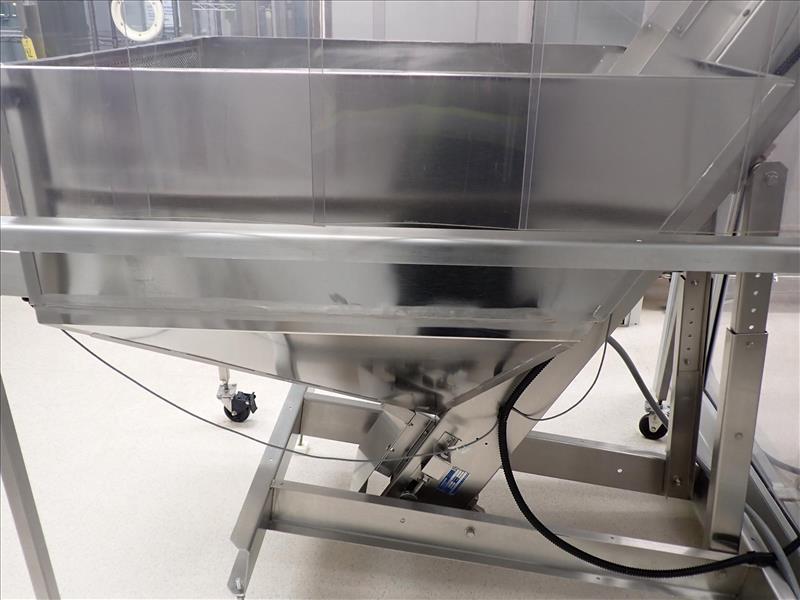 Hoppmann bottle hopper elevator, mod. EP, ser. no. 6531, s/s, 8 in. fluted belt, approx. 42 in. x 48 in. hopper (Subject to confirmation. The winner will be determined based on the sum of bids on lots 92-102 vs on bulk bid lot 91A)